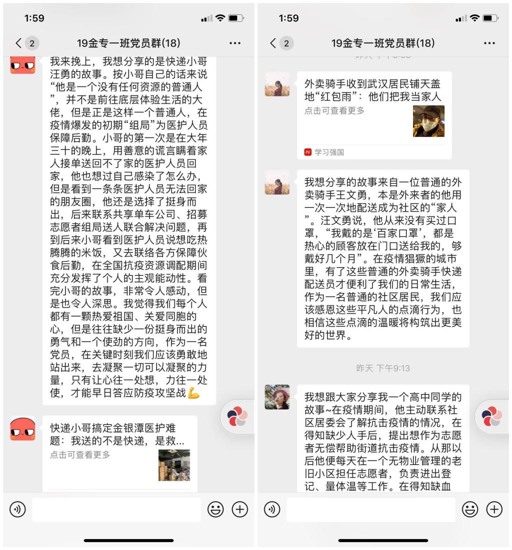 在线上讨论中,同学们积极分享自己身边的抗疫故事。章洪铭、隋仪同志分别分享了抗击疫情中普通群众快递小哥和外卖骑手的故事。章洪铭同志表示:“我觉得我们每个人都有一颗热爱祖国、关爱同胞的心,但是往往缺少一份挺身而出的勇气和一个使劲的方向。作为一名党员,在关键时刻我们应该勇敢地站出来,去凝聚一切可以凝聚的力量,只有让心往一处想,劲往一处使,才能早日打赢防疫攻坚战。”隋仪同志表示:“在疫情猖獗的城市里,正是有了这些普通的外卖骑手快递配送员才便利了我们的日常生活,作为一名普通的社区居民,我们应该感恩这些平凡人的点滴行为,也相信这些点滴的温暖将构筑出更美好的世界。”