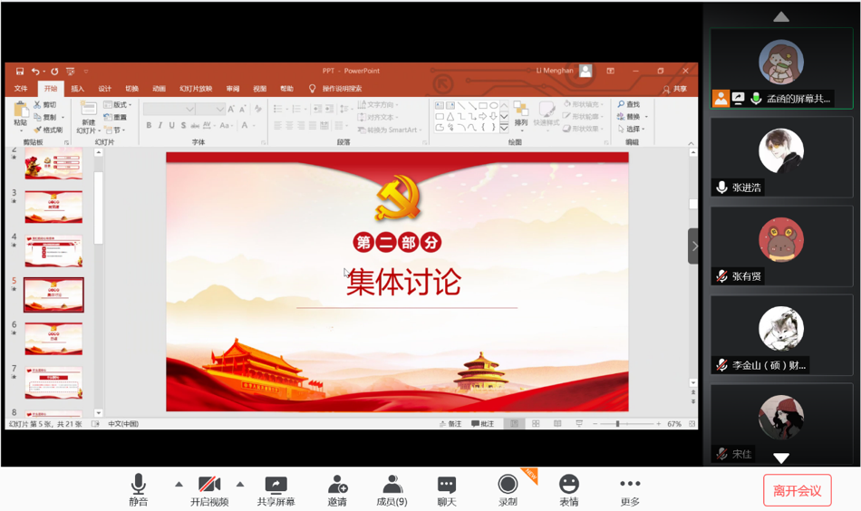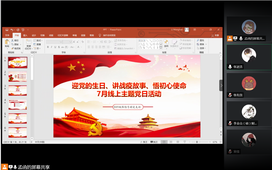 7月10日晚8点,2019级保险专硕党支部通过腾讯会议平台顺利开展了以“在疫情防控斗争中践行初心使命”为主题的微党课以及7月主题党日活动。全体党员和积极分子参与学习并进行了积极讨论。本次活动的流程为党支部书记李梦菡为大家讲授专题微党课,之后全体成员认真观看学习了由孙华玲老师讲授的公司党委战“疫”微党课,最后大家分享了自己的学习心得体会并讲述了身边的抗疫故事。