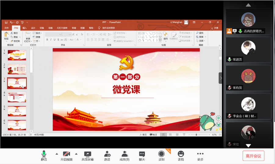 本次会议由党支部书记李梦菡同志主持。李梦菡同志首先为大家讲授专题微党课,此次微党课紧密围绕习近平总书记关于疫情防控重要讲话和指示批示精神,通过讲授身边的抗疫故事加深大家的理解与感悟。李梦菡同志强调,在这场抗疫斗争中,党员必须坚定政治信仰,担当起自己的责任。李梦菡同志还为大家讲授了党中央集中统一领导疫情防控的制度优势,并强调党员同志要在疫情防控斗争中践行初心使命。