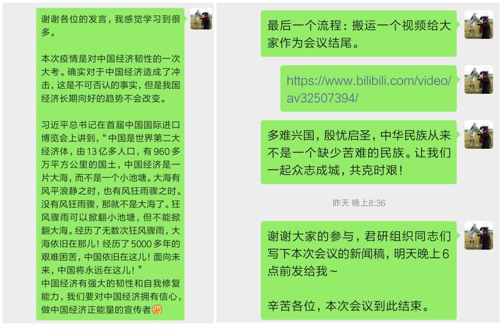 经过充分的讨论与交流,全体党员同志形成共识,马申娟同志总结道,本次疫情是对中国经济韧性的一次大考,确实对于中国经济造成了冲击,这是不可否认的事实,但中国经济有强大的韧性和自我修复能力,我们要对中国经济拥有信心,做中国经济正能量的宣传者。会议以全体党员一起观看“为实现中华民族伟大复兴而奋斗不息”主题视频作为结尾。