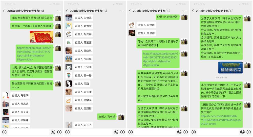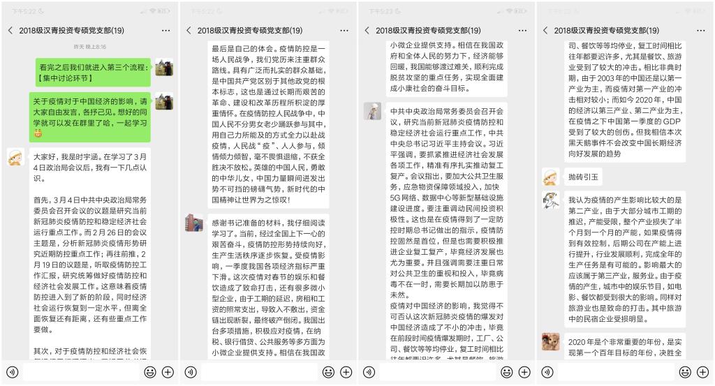 2020年3月14日晚8点,2018级汉青投资专硕党支部“画好共同抗击疫情的同心圆”3月线上主题党日活动在支部微信群中正式开始。本次会议由支部书记马申娟同志主持,全体党员参与。
