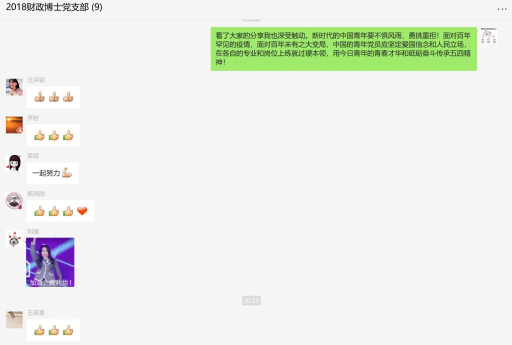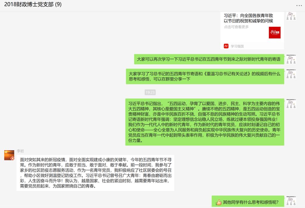 五四青年节前夕,习近平总书记寄语新时代青年“青春由磨砺而出彩,人生因奋斗而升华”,要求新时代青年“继承和发扬五四精神”,在实现中华民族伟大复兴中国梦的新长征路上奋勇搏击。为宣传贯彻习近平总书记关于青年工作的重要思想,特别是习近平总书记对新时代青年的重要寄语精神,在上级党委的统一安排部署下,2018级财政博士党支部组织开展了“弘扬五四精神”线上主题党日活动。活动于2020年5月13日晚7点开始,由党支部书记刘春阳主持。