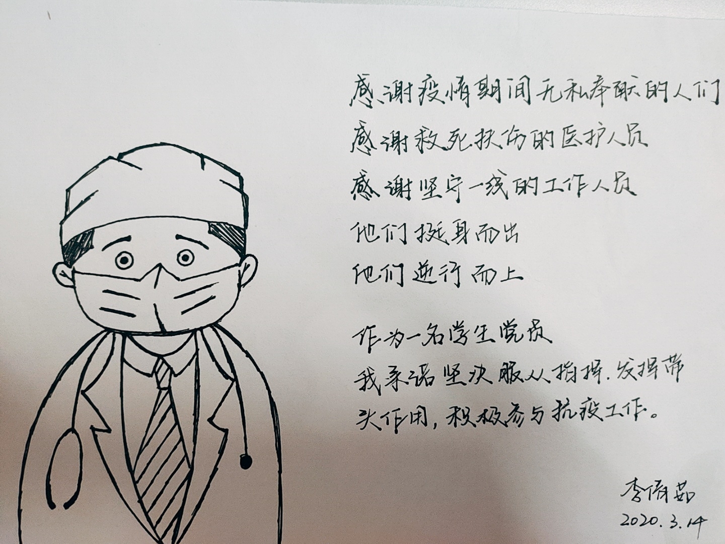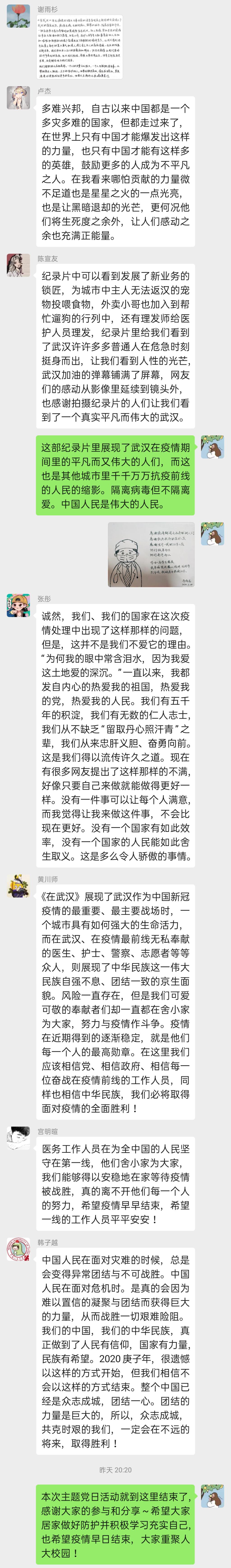 党员来正杰说道,“说不害怕当然是假的,但这是我们必须要赢的战斗!”致敬所有逆行者!致敬所有一线医护人员!致敬八方支援的每个平凡而又伟大的中国人!他们都是我们的英雄!!中国加油!武汉加油!当祖国遇到危难的时刻,总会有许许多多的英雄挺身而出。平凡的英雄们奋战在这座英雄的城市,这使我们终将战胜疫情和病魔!大家都分享了自己的心得体会,部分党员还通过手写文字和绘画等方式表示了自己对一线工作人员的致敬。