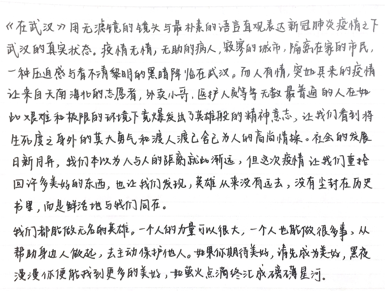 党员张皓宇谈到,这次疫情中所涌现出来的都是平凡人中的英雄。志愿者司机师傅一句“说不害怕是假的”让我心里一颤,是啊,哪有什么无所畏惧的英雄,不过是每个人小心翼翼地把自己的担忧害怕隐藏在口罩护目镜防护服之下,以更勇敢的姿态支持自己,也安抚他人。再看到走街串巷给猫喂粮的锁匠,挨个跑药店配药、跑超市代购的外卖骑手,这不仅是工作,更是生命。听到来自四川的援鄂医生黄维平静地叙述自己的援鄂故事,我的心中却久久难以平静,我可以想象到他开车离家,两个儿子在身后哭着喊爸爸的画面,孩子不一定真的知道新冠疫情到底是怎样的发展状况,但他们对生死有判断,他们知道爸爸这一去很可能就不返了。但黄医生却硬是让自己狠下心来,离开了较为安全的家乡,离开了父母妻儿,独自一人“无名无份”前往武汉,无非是因为他心疼前线的战友。过去在人们心中的英雄形象总是神奇、完美得不像话,让我们觉得想成为英雄真难,但今天,千千万万的平凡人让英雄这类形象更加接地气了,他们用事实告诉我们,英雄其实就在我们身边,如果你愿意,你也可以。