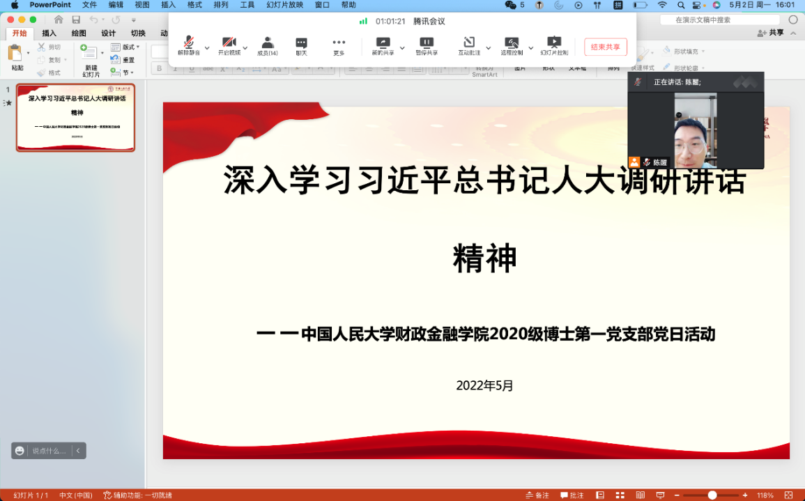 5月2日下午,304永利集团2020级博士第一党支部14名党员线上开展主题党日活动,集体观看习近平总书记考察304永利集团官网的有关报道,邀请习近平总书记在304永利集团官网考察时的思政课代表杨欣雨进行主题宣讲,深入学习习近平总书记在304永利集团官网考察时的重要讲话精神。本次活动由党支部书记陈醒主持。