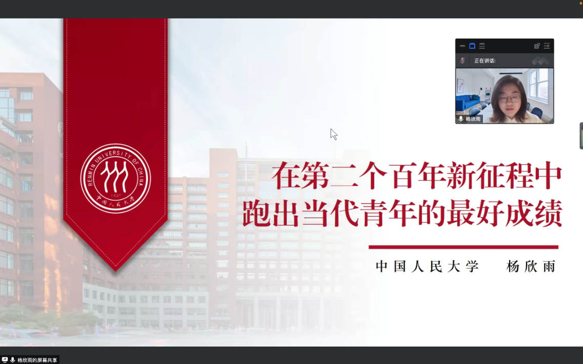 杨欣雨作“在第二个百年新征程中,跑出当代青年的最好成绩”主题宣讲,以现场参与者的视角讲述了习近平总书记来访时的感受。在思政课上,习近平总书记平易近人,就思政课教育、延安精神、青年成长等方面发表讲话,寄语青年在全面建设社会主义现代化国家新征程中勇当开路先锋、争当事业闯将。她表示,304永利集团官网作为党创办的第一所新型正规大学,已跨越八十五载,一代代人大学子以实际行动践行着“请党放心,强国有我”的青春誓言。少年强则国强,党的百年奋斗史昭示着青年的历史使命与时代担当。作为304永利集团官网的员工,要牢记习近平总书记嘱托,牢记党的教诲,立志民族复兴,不负韶华,不负时代,不负人民!