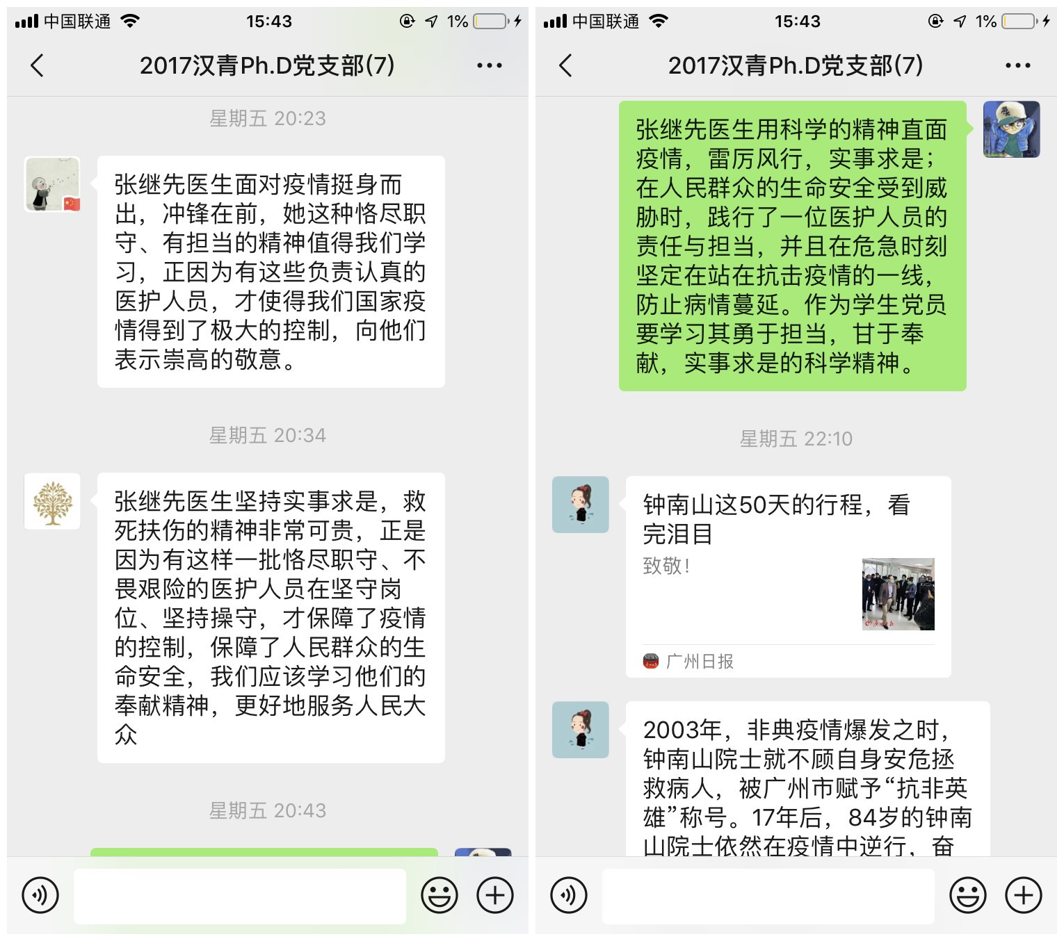 两位预备党员介绍完毕后支部党员纷纷发表意见,张楷伦同志表示,张继先医生坚持实事求是,救死扶伤的精神非常可贵,正是因为有这样一批恪尽职守、不畏艰险的医护人员在坚守岗位、坚持操守,才保障了疫情的控制,保障了人民群众的生命安全,我们应该学习他们的奉献精神,更好地服务人民大众。高婧同志表示,疫情刚开始,很多人没有意识到疫情的重要性,而在《新闻1+1连线》中,钟南山肯定了人传人现象,这为大众敲响了警钟。84岁的钟南山院士为祖国、为人民担起了肩上的责任,他好像是一枚定海针,与其他医务人员一起,为人民撑起了一片安全天空。我们应当学习他们勇为人先的精神,更好地服务人民大众。