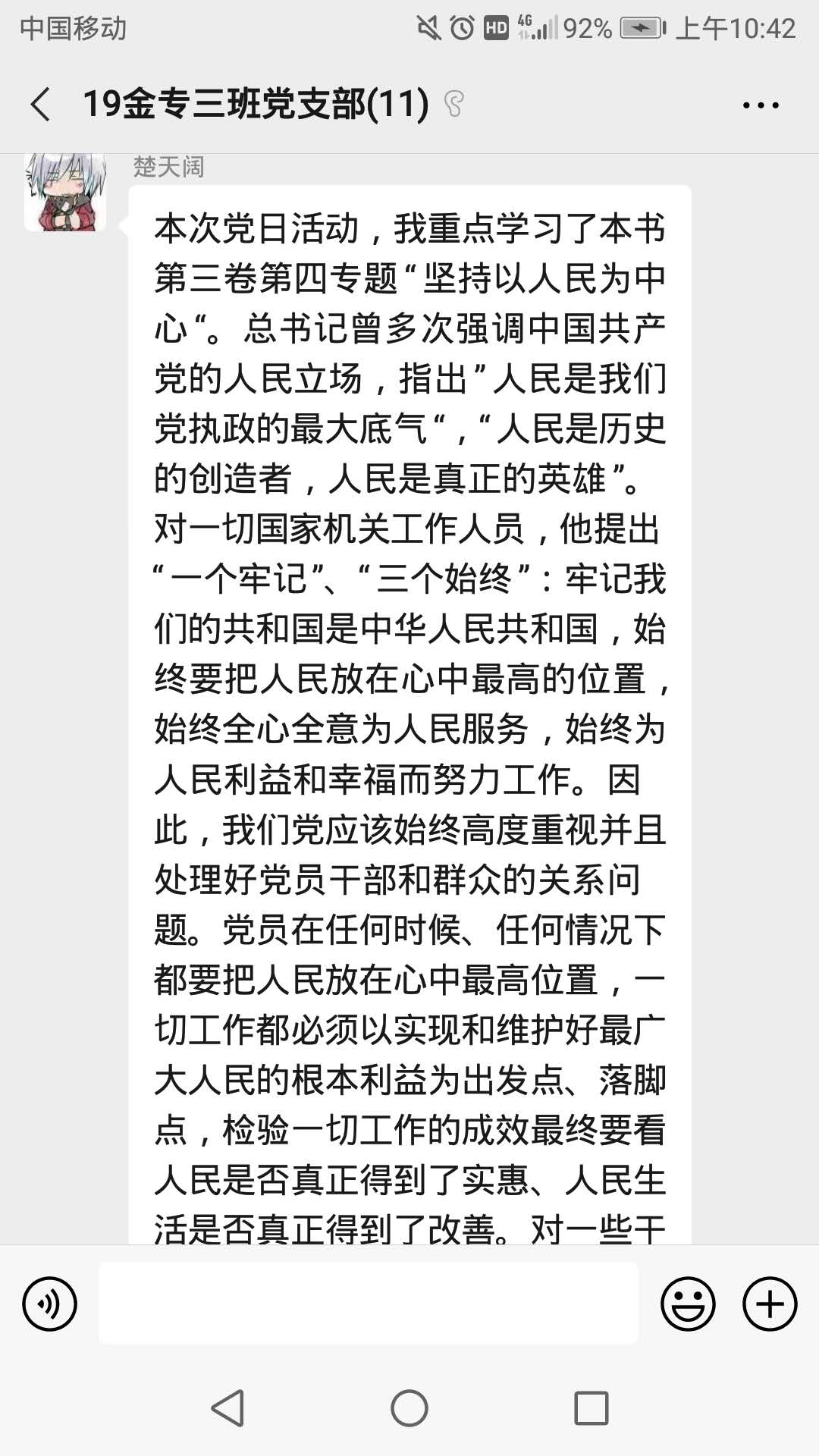 会议开始,9名党员同志将自己对于《习近平谈治国理政第三卷》的学习心得发到支部群内,互相交流学习。《习近平谈治国理政第三卷》共有十九个章节,9名党员同志分别就“决战脱贫攻坚”、“坚持以人民为中心”、“铸就中华文化新辉煌”、“提高保障和改善民生水平”、“完善和发展我国国家制度和治理体系”、“推动共建‘一带一路’走深走实”、“谱写新时代中国特色社会主义新篇章”、“推动经济高质量发展”八个章节发表了自己的学习体会。在对以上章节的交流讨论中,同学们既提到了与相关专题相关的理论知识,也提到了党和国家在这些方面所做的实事,无论是脱贫攻坚,还是改善民生,党和国家始终将人民放在第一位,坚持发展为了人民、发展依靠人民。