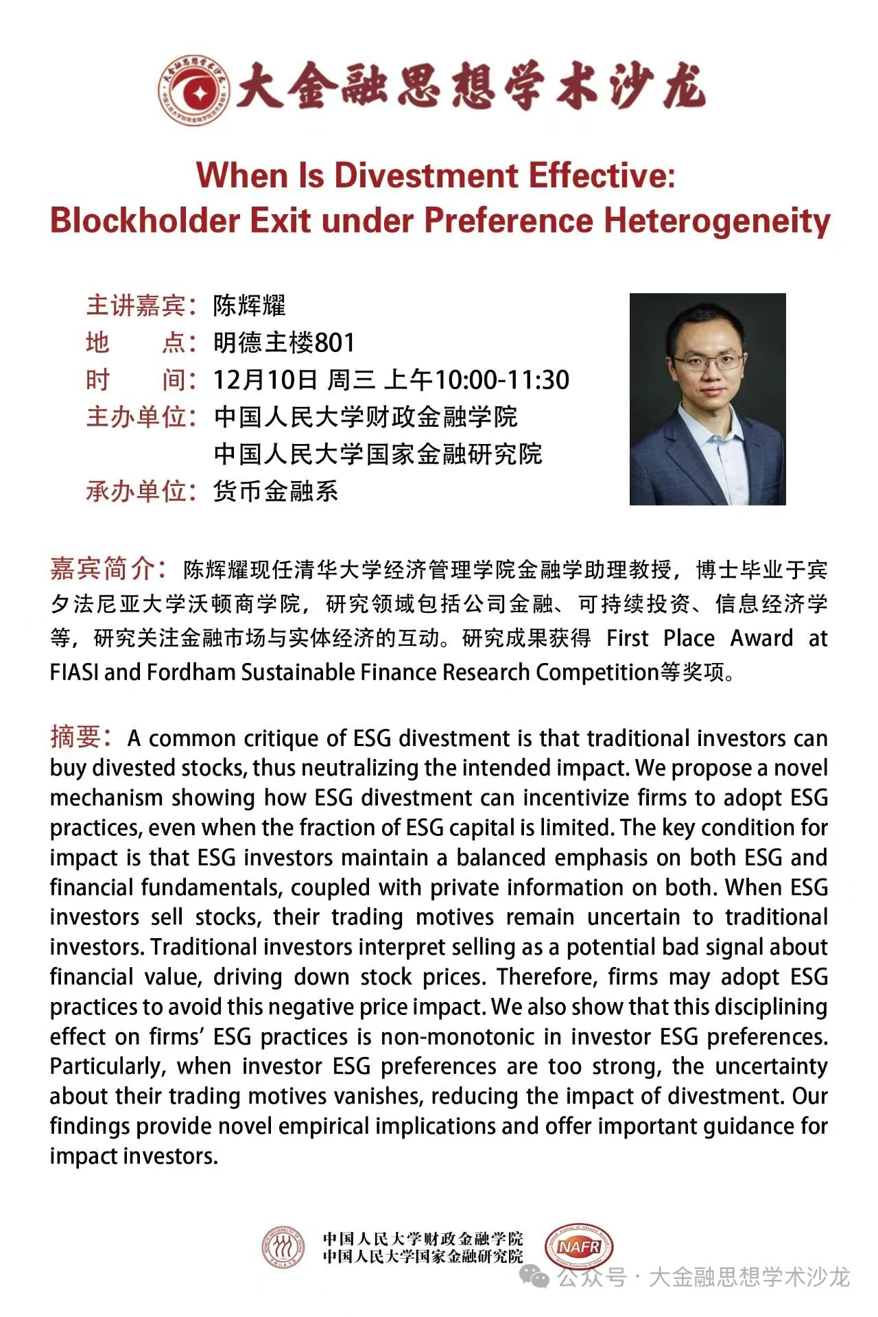 He is currently an Assistant Professor of Finance at the School of Economics and Management, Tsinghua University. He earned his Ph.D. from the Wharton School at the University of Pennsylvania. His research areas include corporate finance, sustainable investing, and information economics, focusing on the interaction between financial markets and the real economy. His research has received awards such as the First Place Award at FIASI and the Fordham Sustainable Finance Research Competition.