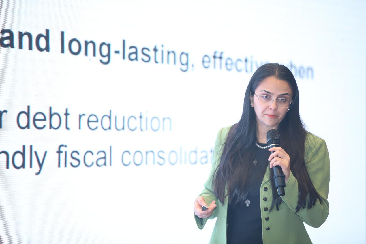 接着,Prachi Mishra女士发表主题演讲,探讨了真正降低公共债务率的两大措施:财政整顿和债务重组。要提高财政整顿的成功率,需要在三个条件下进行:在经济向好或经济复苏期间以及全球不确定性较低时进行;最初的债务高峰期是财政整顿最关键的时刻;更多地采用支出而非收入进行财政整顿。对于债务重组,她认为需要关注三个要点:第一,减少债务可以通过减记或调整票面利率或延长期限来实现,但这需要与债权人达成协议;第二,需要与其他一系列工作进行协调;第三,无论采取何种方式,必须具备足够深度,并且要与其他政策相互配合。