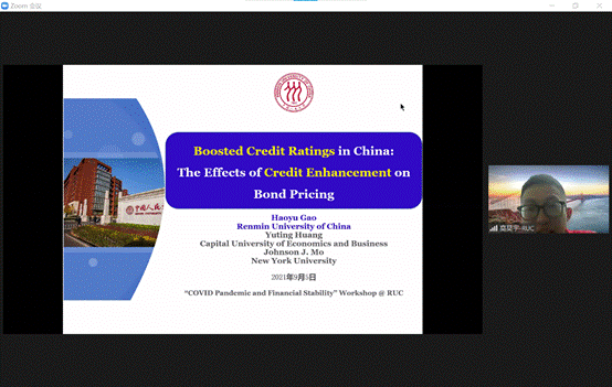 研讨会第一部分,公司刘昕、高昊宇和首都经济贸易大学的郑伟男老师进行了论文展示。刘昕老师题为Does Liquidity Management Induce Fragility in Treasury Prices? Evidence from Bond Mutual Funds的文章发现持有低流动性资产的债券类基金利用国债来进行流动性管理,因此对于这些基金的流动性冲击会被传递并集中反映到国债的价格上,文章用2003年的共同基金丑闻作为外生冲击进行验证,这一研究结果有助于解释新冠疫情期间美国国债市场的动荡,上海交通大学的洪玉蓉老师对这篇文章进行了评论。郑伟男老师题为Information Asymmetry, Non-Learnable Payoff and the Cost of Capital的文章分析了当资产收益中存在不可预知的成分时信息不对称对于资产价格的影响,发现不可预知的收益会使得拥有更精确信息的投资者的信息优势下降,导致资产价格会受到信息不对称程度的影响,信息不对称程度的增加会使得资产价格有效性下降和融资成本上升,曼彻斯特大学的邹季洋老师对这篇文章进行了评论。高昊宇老师题为Boosted Credit Ratings in China: The Effects of Credit Enhancement on Bond Pricing的文章发现在中国的信用债市场上,信用增级能够减小债券的信用利差,文章通过倾向得分匹配、工具变量和固定效应来解决内生性问题,发现其影响机制有风险降低与损失共担两种途径,研究结果说明了信用增级工具在低评级公司发行高评级债券的过程中所起到的重要作用,对外经贸大学的刘津宇老师对这篇文章进行了评论。
