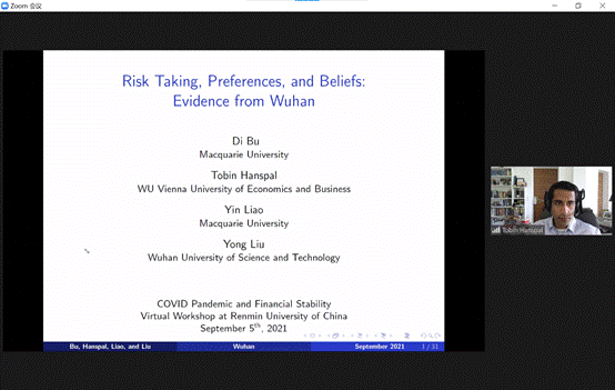 研讨会第二部分,维也纳经济大学的Tobin Hanspal、圣加仑大学的Vesa Pursiainen和鹿特丹伊拉斯姆斯大学的Mikael Paaso老师进行了论文展示。Hanspal老师题为Risk Taking, Preferences, and Beliefs: Evidence from Wuhan的文章对新冠疫情发生前后武汉地区群众的风险承受能力进行了研究,对于受到疫情不同程度影响的受试对象的调查显示,受到疫情影响更严重的人群具有更低的风险承受能力、更少的风险资产投资和更悲观的预期,研究结果表明疫情通过对不同人群的异质性影响产生了不同程度的风险承受能力的影响,巴斯大学的孙汉文老师对这篇文章进行了评论。Pursiainen老师题为Stress Testing Banks' Digital Capabilities: Evidence From the COVID-19 Pandemic的文章研究了新冠疫情期间银行的信息技术水平与其服务客户的能力之间的关系,发现由于新冠疫情带来的电子银行服务的需求冲击,具有更高信息技术水平的银行,在客户访问量和经营业绩等方面都明显更高,受疫情影响更大的公司会选择信息技术水平更高的银行,而受疫情影响更大的银行更可能提升其信息技术水平,上海科技大学的周彤老师对这篇文章进行了评论。Paaso老师题为Trust in Finance and Consumer Fintech Adoption的文章研究了消费者对于传统金融的信任程度与其对金融科技产品的接受能力之间的关系,经过调查和实验发现,消费者对于传统金融的信任程度并不会对其在金融科技产品上的接受能力产生显著的影响,研究结果表明消费者会将金融科技产品作为独立于传统金融的产品来看待,北京大学的徐宇晨老师对这篇文章进行了评论。