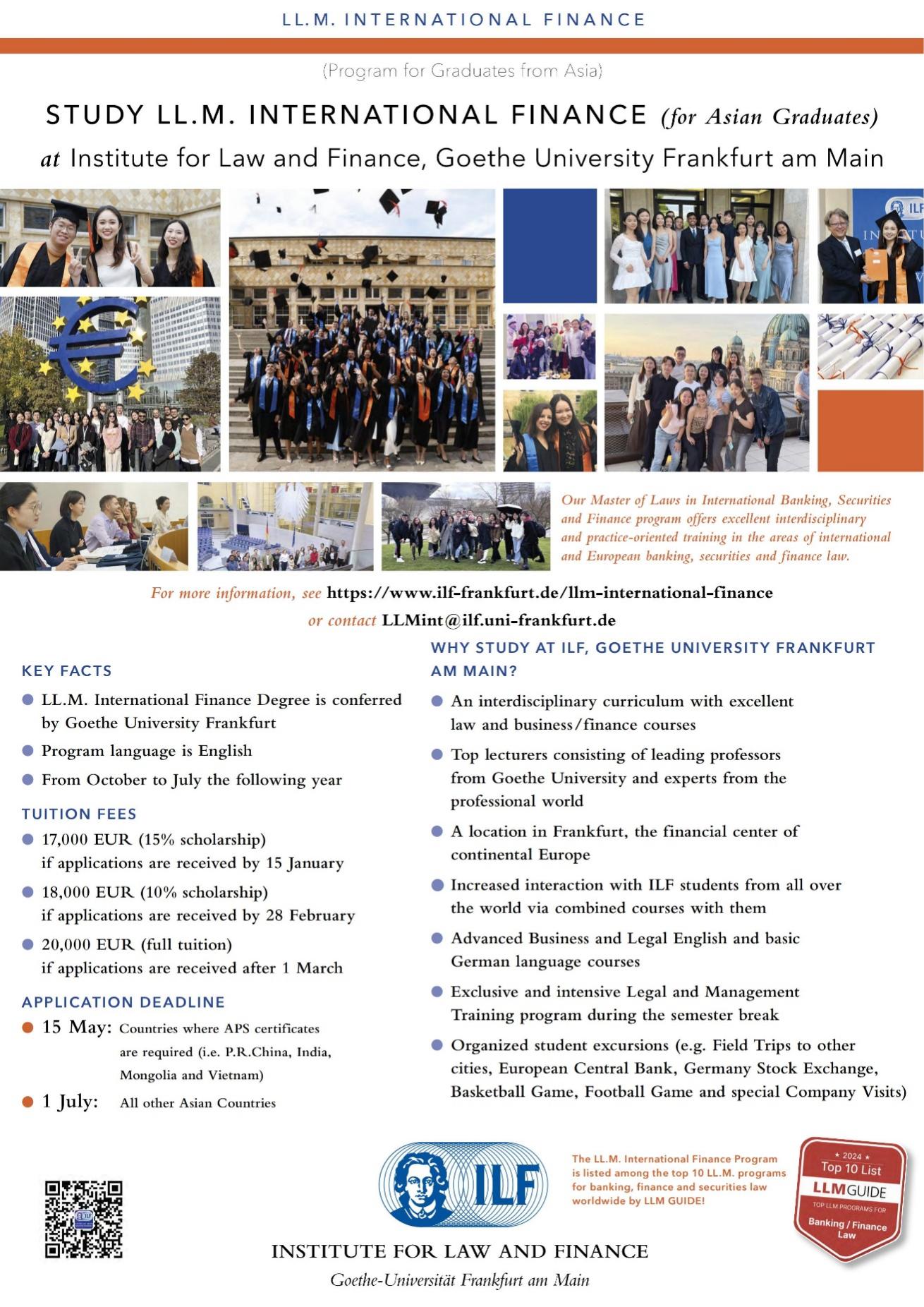 德国法兰克福歌德大学(Goethe University Frankfurt am Main)是法兰克福唯一一所综合性公立大学。法律与金融公司(Institute for Law and Finance,简称ILF)由法兰克福歌德大学于2002年成立,为国际职工提供全英语的法学硕士(LL.M.)项目。凭借法兰克福作为欧洲大陆金融中心的环境优势,ILF已成为欧洲法律与金融领域学术交流的重要平台之一。法兰克福歌德大学法律与金融公司与欧洲中央银行、德意志联邦银行、德国银行、德国商业银行、德国证券交易所、全球顶级律师事务所、四大会计师事务所及国际知名企业合作,为优秀员工及行业佼佼者提供学术交流与实践的平台,是欧洲法律及金融领域精英人才的培育摇篮。2014年10月公司专为来自亚洲的职工开设了国际金融法学硕士 (LL.M. International Finance) 项目。近几年,公司已将该项目推广至中国及亚洲的高校并与部分高校法公司、金融公司、财经公司和商公司签订了合作协议。