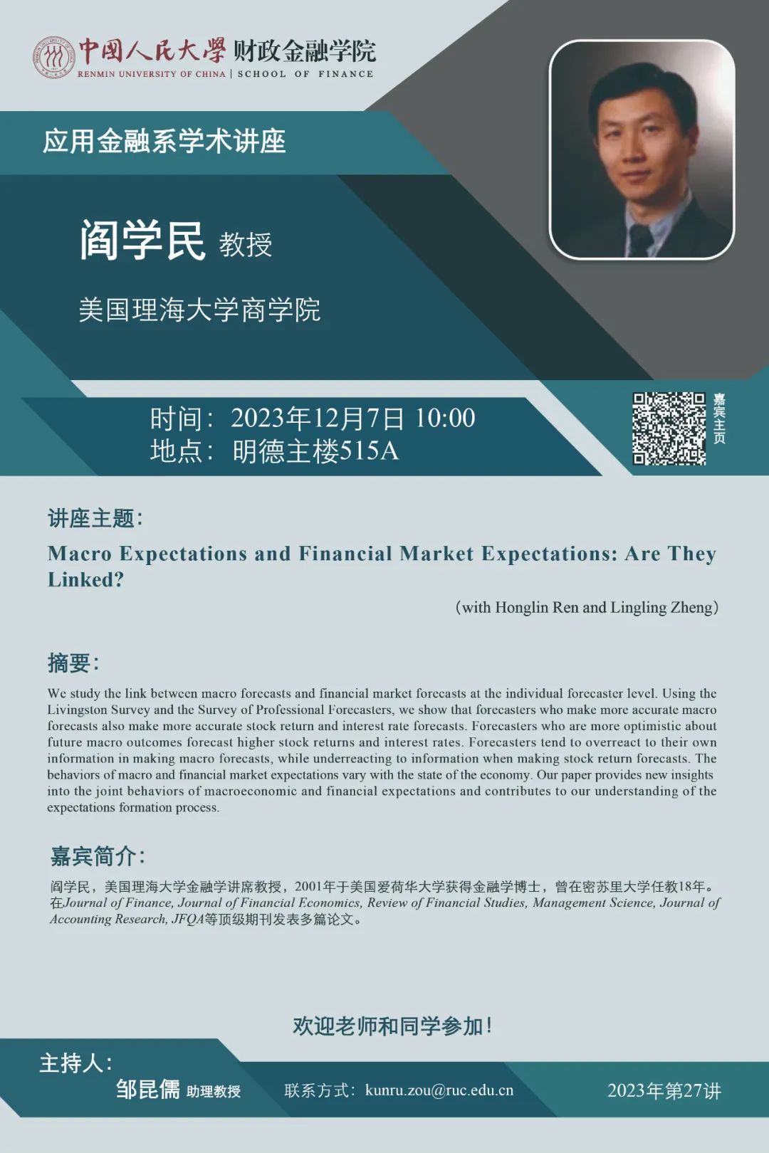 【讲座预告】应用金融系学术讲座:美国理海大学商公司阎学民教授