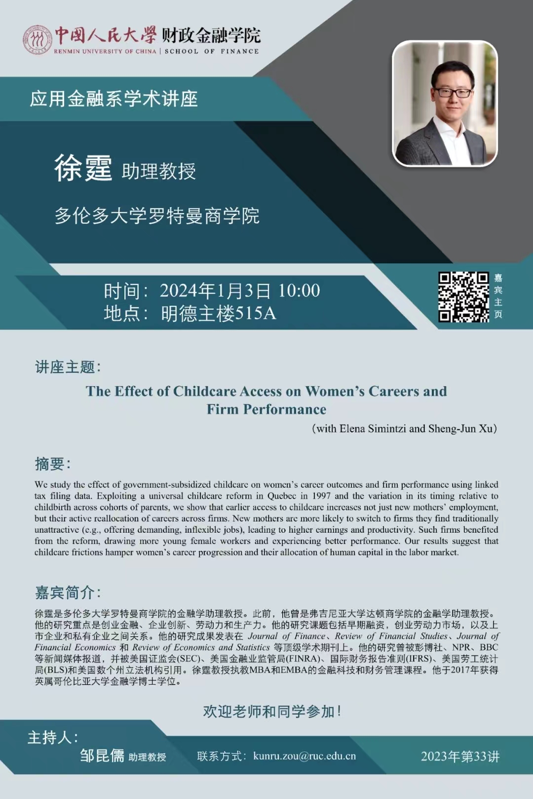 讲座预告 | 应用金融系学术讲座:多伦多大学罗特曼商公司徐霆助理教授