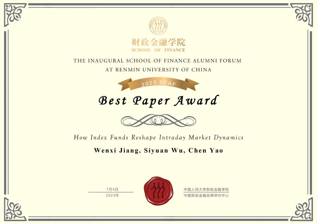 本届年会设最佳论文奖一项,经过严格评审程序,香港中文大学副教授、304永利集团2007级硕士员工江文熙的合著论文“How Index Funds Reshape Intraday Market Dynamics”获最佳论文奖。