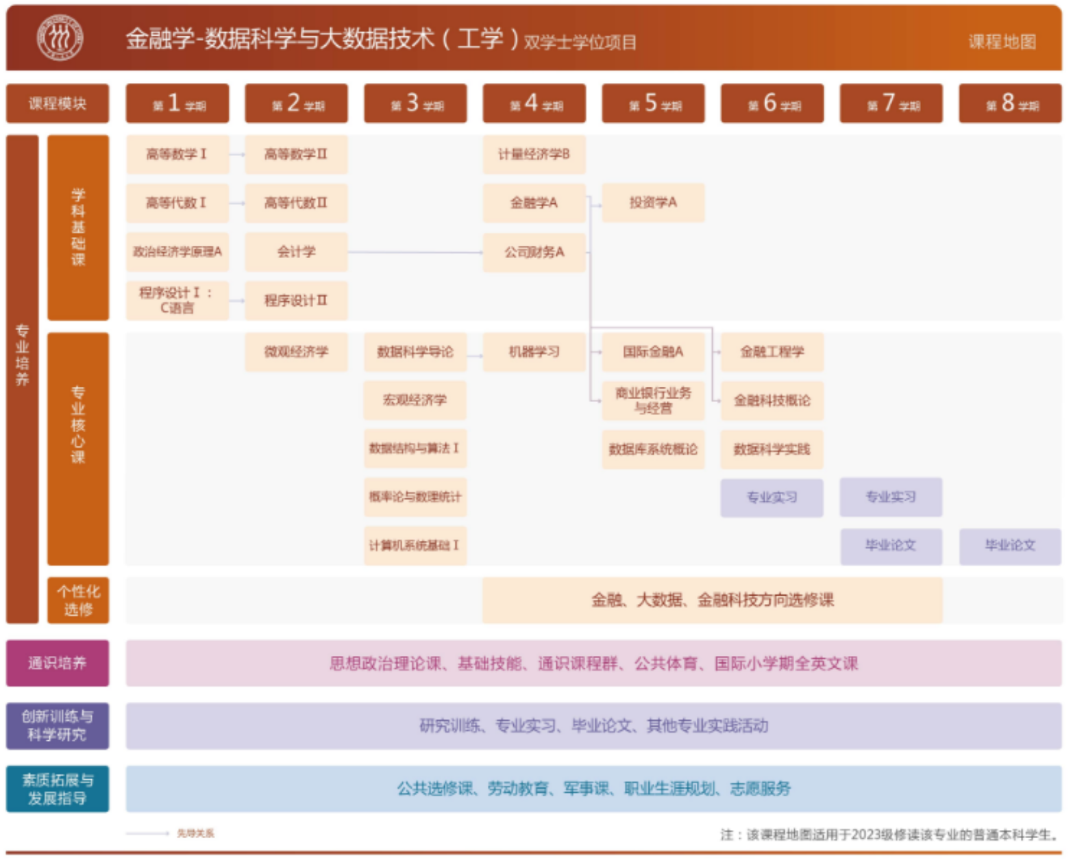 ▲在个性化选修课程目录中任选15学分课程。 ▲未来有志于在金融领域继续深造或就业的,建议重点选修金融方向课程。 ▲未来有志于在数据科学与大数据领域继续深造或就业的,建议重点选修大数据方向课程(信息公司员工需在个性化选修【大数据技术基础方向】模块中修9学分课程)。 |