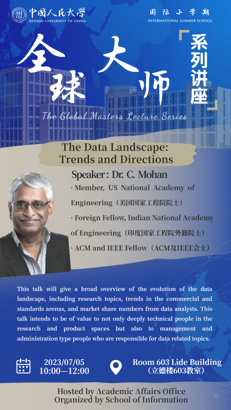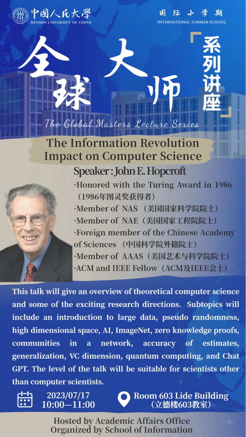 为推动计算机学科发展,信息公司组织了两次全球大师系列讲座。首先邀请到C. Mohan教授。 C. Mohan教授是美国国家工程院院士,清华大学杰出访问教授,IBM印度首席研究员。Mohan教授曾获得 ACM SIGMOD Edgar F. Codd Innovations Award和 VLDB 10 Year Best Paper Award。Mohan教授所提出的ARIES方法被广泛用于数据库管理系统中,也是数据库教科书中的经典算法。此外,还邀请到约翰·霍普克罗夫特(John Edward Hopcroft)教授。约翰·霍普克罗夫特(John Edward Hopcroft)教授1986年图灵奖获得者,现任北京大学访问讲席教授、前沿计算研究中心主任,美国康奈尔大学计算机科学系工程与应用数学荣休教授。先后当选美国艺术与科公司、美国国家工程院和美国国家科公司院士;2017年,当选中国科公司外籍院士。