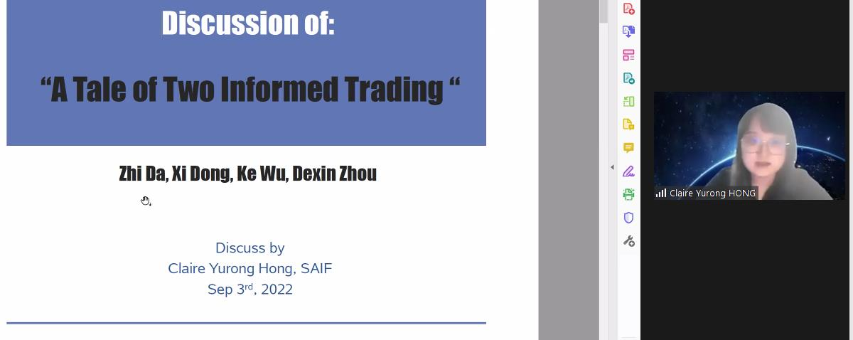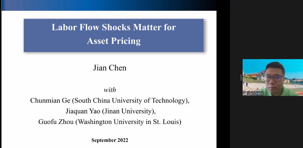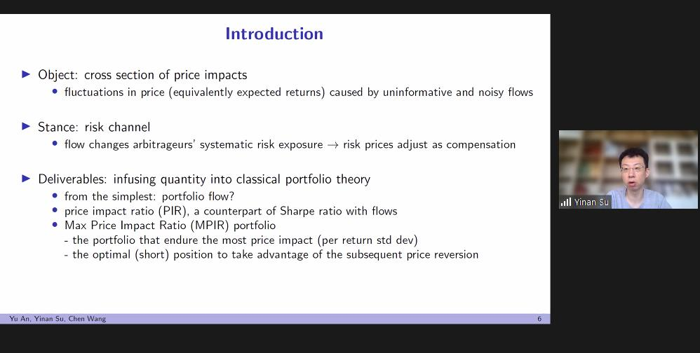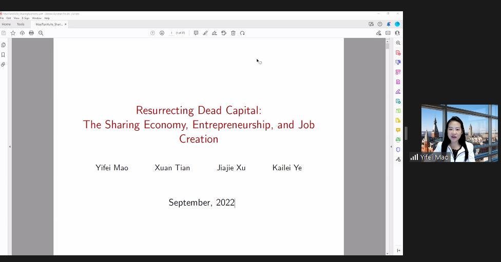 上午会议的第一部分。来自约翰斯霍普金斯大学的Yinan Su、康奈尔大学的Yifei Mao展示了论文。Yinan Su题为Flow-Based Asset Pricing: Maximum Price Impact Ratio的文章发现非信息流的价格影响作为边际投资者的风险补偿而产生,在给定的基本风险水平下,做空能产生最大价格影响的投资组合是最有效的反流动交易策略。伦敦政经公司的Thummim Cho对这篇论文进行了点评。Yifei Mao题为Resurrecting Dead Capital: The Sharing Economy, Entrepreneurship, and Job Creation的文章以爱彼迎的渗透程度作为共享经济和风险资本发展的代理变量,发现爱彼迎对当地企业的创建具有刺激作用,为研究共享经济的实际影响提供了新的视角。岭南大学的Lai Wei对这篇文章进行了点评。