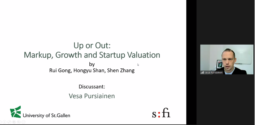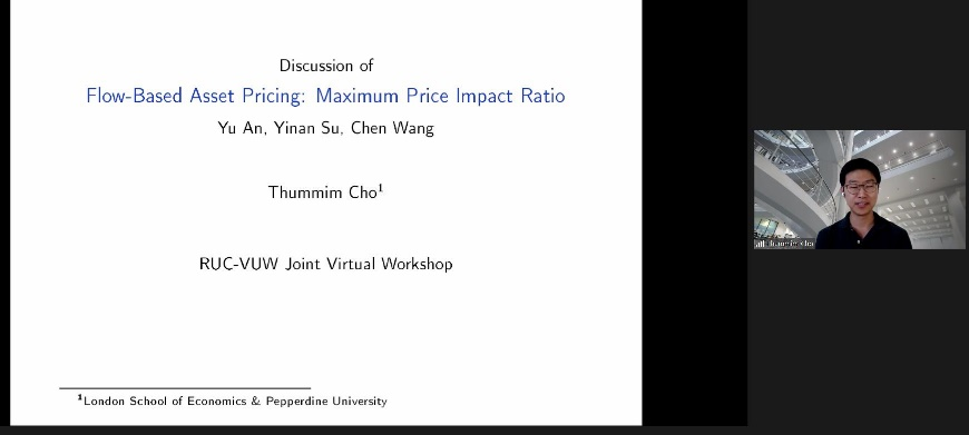 下午会议的第一部分。来自惠灵顿维多利亚大学的Jinji Hao、中欧国际工商公司的单宏宇分享了论文。Jinji Hao题为The Cross-Section of Expected Total Housing Returns的文章研究了预期住房总收益的截面决定因素,发现了显著的价值效应、动量效应和逆转效应。山东大学的张群姿点评了这篇论文。单宏宇题为Up or Out:Markup,Growth and Startup Valuation的文章研究了企业如何在盈利能力、增长和估值等战略目标中平衡,讨论了使得企业估值接近其盈利能力的条件。圣加仑大学的Vesa Pursiainen点评了这篇文章。