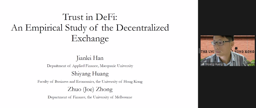 简短的休息后。香港大学的黄诗杨发表题为Trust in DeFi:An Empirical Study of the Decentralized Exchange的主题演讲。黄诗杨介绍了“去中心化金融”的发展,利用去中心化交易所的数据研究了去中心化基础设施如何影响代理人的投资决策和价格。报告指出,Uniswap对表现出高不确定性、拥有更多Uniswap用户、高虚假交易量等特点的加密货币的影响更大。