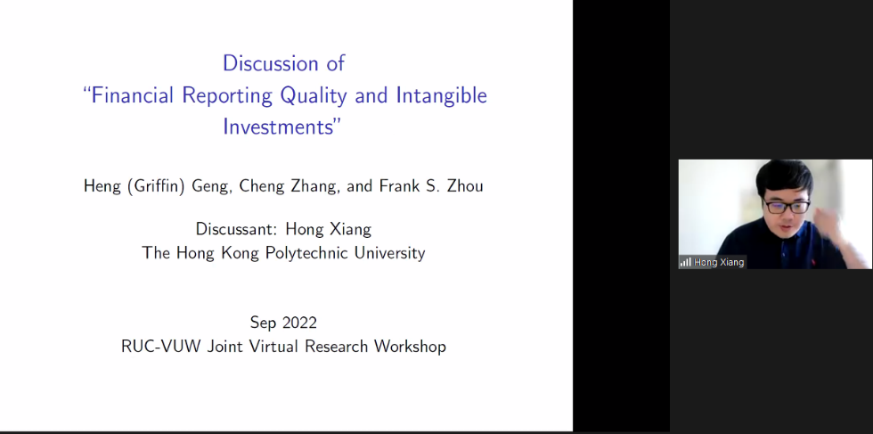 上午会议的第二部分。来自惠灵顿维多利亚大学的Cheng Zhang和公司博士研究生霍晓霖展示了论文。Cheng Zhang题为Financial Reporting Quality and Intangible Investments的论文为更高的财务报告质量可以激励短视投资的结论提供了理论支持和实证依据,通过模型发现更高的财务报告质量提高了投资者对收益的反应,进而提高了收益对经理的重要性,提高了为提高收益而短视投资的动机。香港理工大学的Hong Xiang对这篇论文进行了点评。霍晓霖题为Economic Links from Bonds and Cross-stock Return Predictability的论文利用公司债券的利率联动性度量公司之间的经济关联,发现股票市场上存在截面收益的可预测性。新加坡管理大学的李伟凯对这篇文章进行了点评。