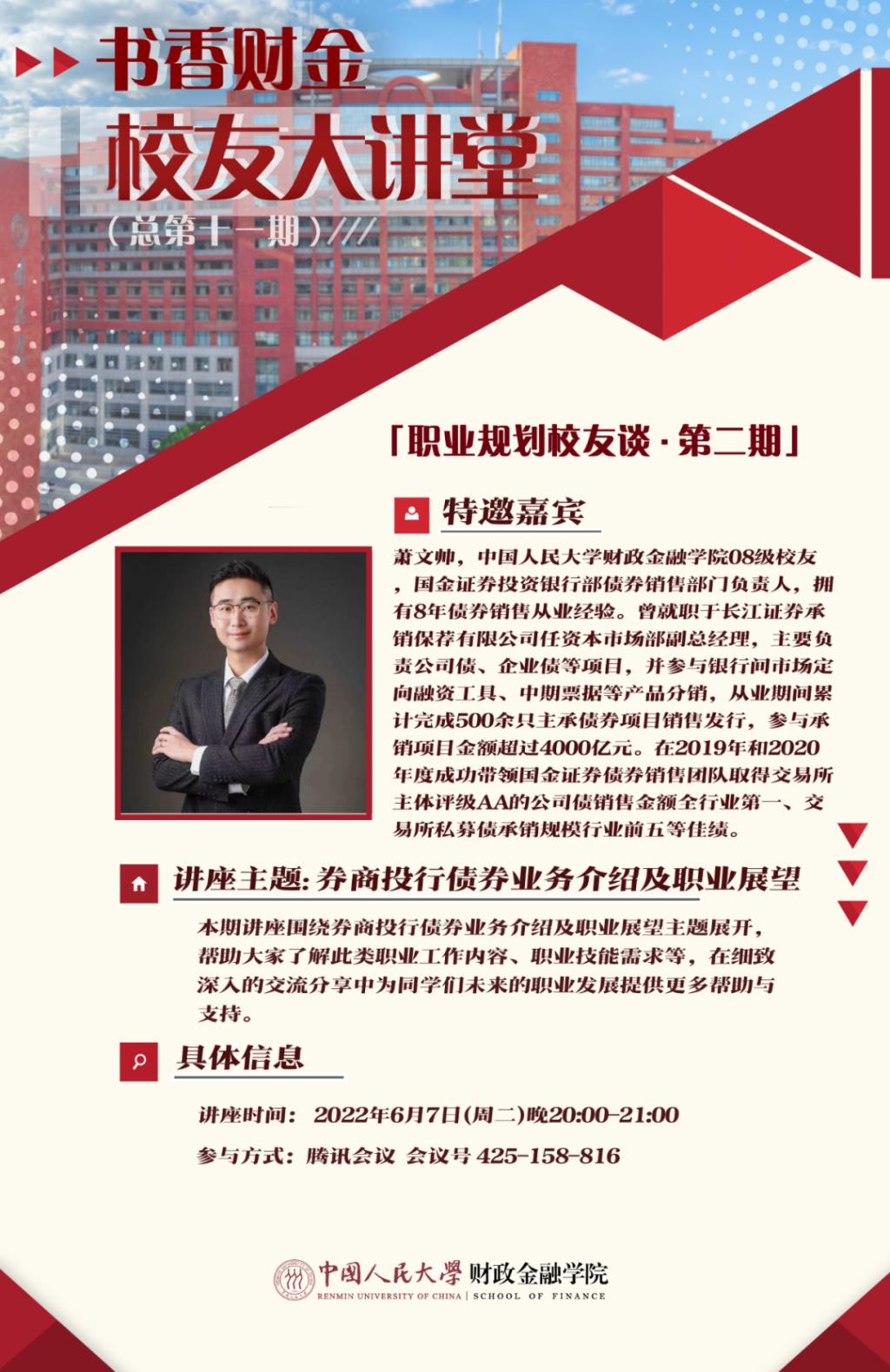 本期讲座围绕券商投行债券业务介绍及职业展望主题展开,帮助大家了解此类职业工作内容、职业技能需求等,在细致深入的交流分享中为同学们未来的职业发展提供更多帮助与支持。