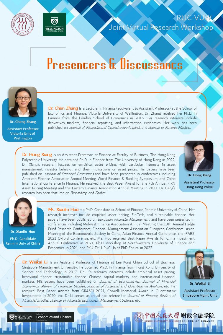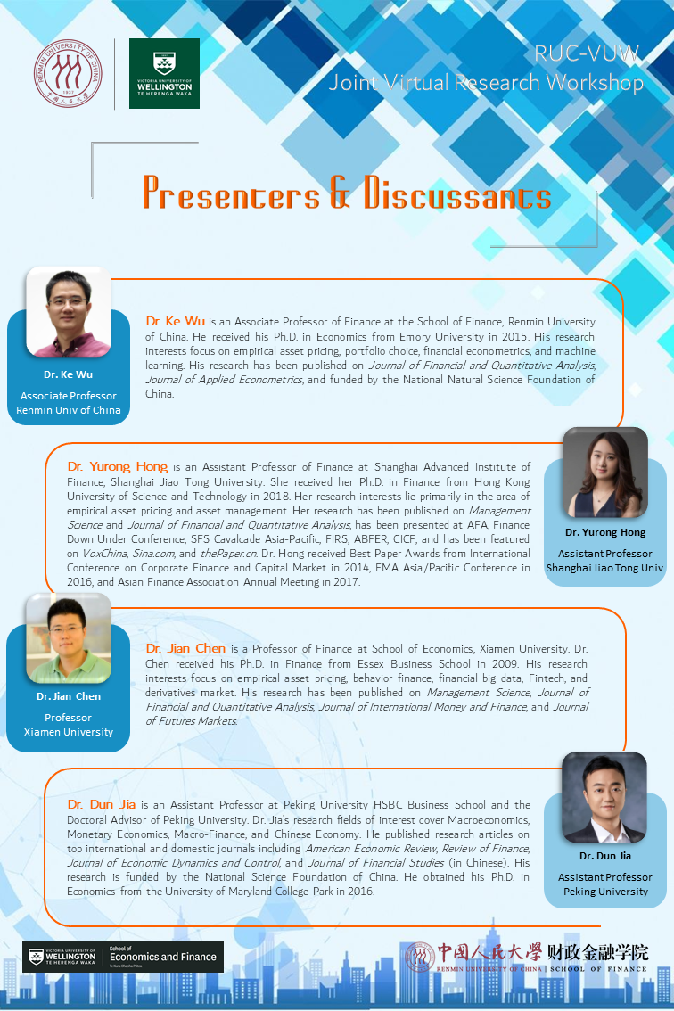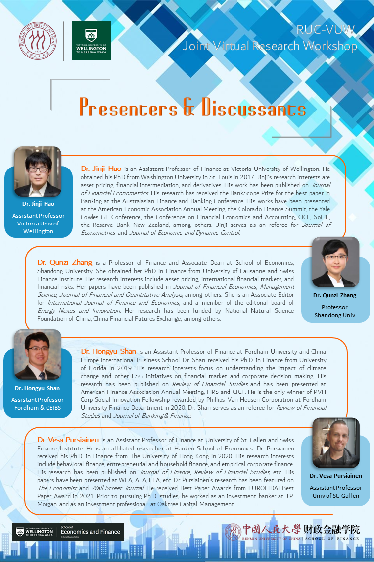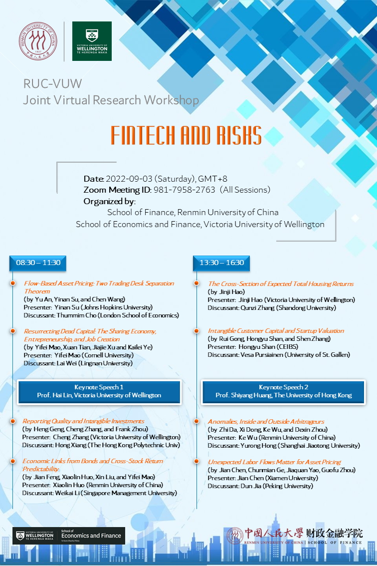 时间:2022-08-23304永利集团联合惠灵顿维多利亚大学经济与金融公司共同组织以金融科技与风险为主题的线上学术论坛。论坛将于北京时间9月3日(周六)上午8:15通过Zoom在线举办(会议号981-7958-2763)。本次论坛邀请到来自美国、英国、瑞士、新西兰、新加坡、中国香港的多位嘉宾,同来自北京大学、上海交通大学、厦门大学、山东大学、中欧商公司和公司的专家学者共同讨论分享最新的研究进展,欢迎老师和同学们踊跃参加!