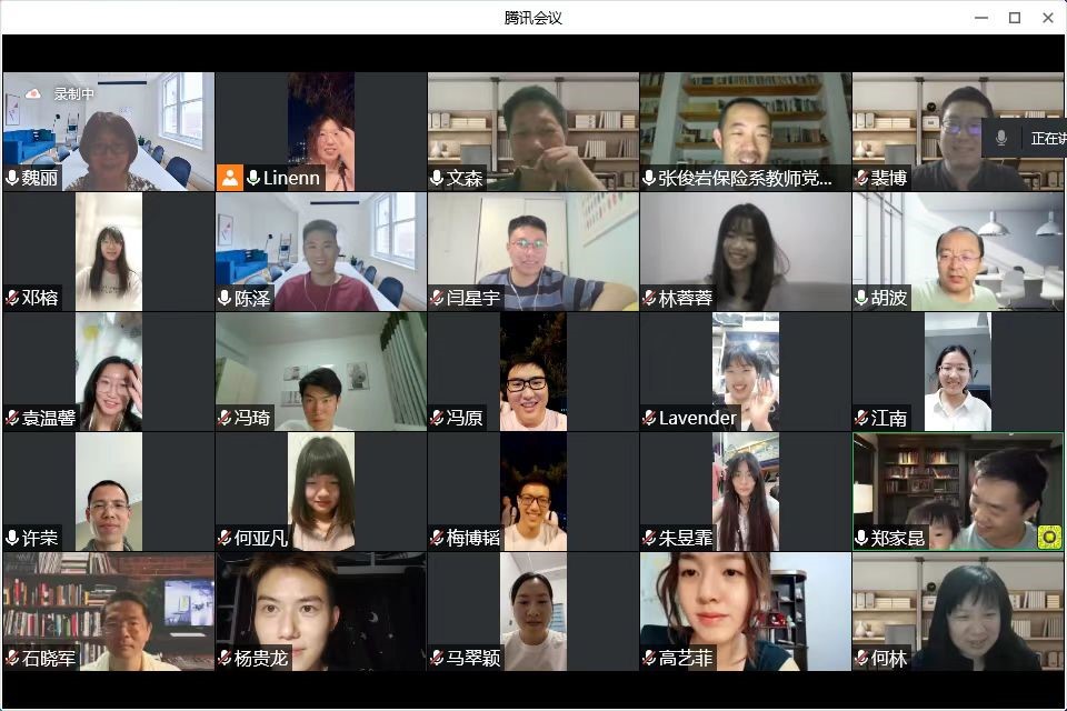 晚上8点40分,刚刚结束“云参观”校史馆主题党日活动的保险系党员师生,又以线上班会的形式,让2020级保险专硕的同学和老师们得以团聚。各位老师表达了对封闭在校的同学们的关心,了解同学们的生活和心理状态,安抚同学们因没有毕业典礼而生的遗憾。老师的关怀中,20位同学依次汇报了毕业去向,券商、保险、银行、互联网金融……,“聚是一团火,散是满天星”,同学们将带着人民大学的红色基因前往各自的岗位发光发热。大部分同学留在北京,也有部分同学选择南下,去到上海、深圳、杭州等地。老师们听到同学们各奔光明的前程,倍感欣慰,衷心地表达了对同学们的祝贺和希冀。班主任戴稳胜老师给予了同学们自信与鼓励,他讲起以往的故事,总是有同学十月份来找他哭诉找不到工作的焦虑,而次年三月又喜气洋洋地说拿到好几个offer,不知道选哪个。戴老师对同学们的能力总有着十足的信心,他希望同学们也一定要自信。魏丽老师像母亲嘱托孩子一般,为同学们讲授人生哲学,她不认同优秀是一种习惯,优秀只是一个评价标准,但结果并非我们自己能控制,希望大家踏入职场后,不要给自己太大压力,记住保险系是大家永远的娘家。张俊岩老师则是一如既往地关心同学们,反复强调无论何时有任何困难一定要告诉老师,老师们会尽最大努力为同学们想办法解决……老师们的嘱托满怀关心与爱,而同学们将带着老师们的祝愿与嘱托,勤奋工作学习,也会常回家看看,与恩师再聚。