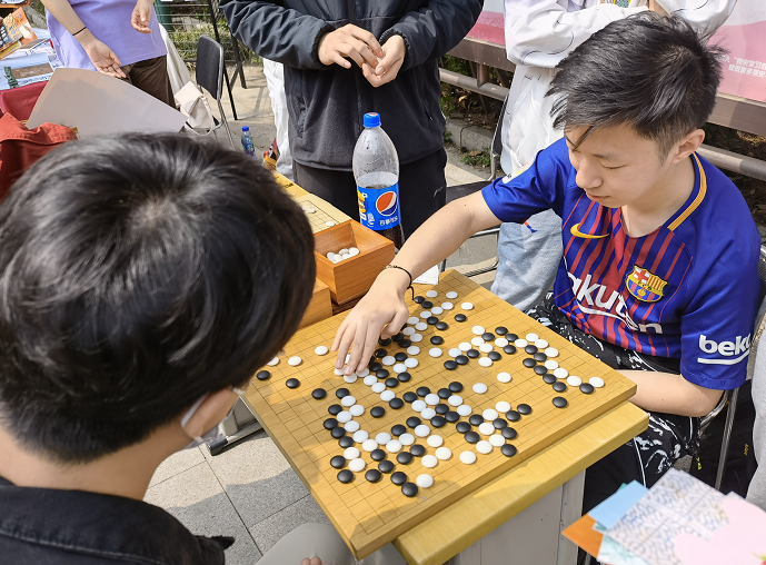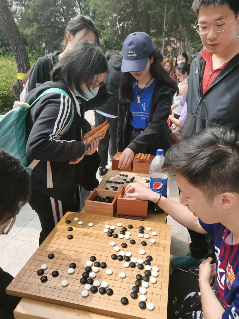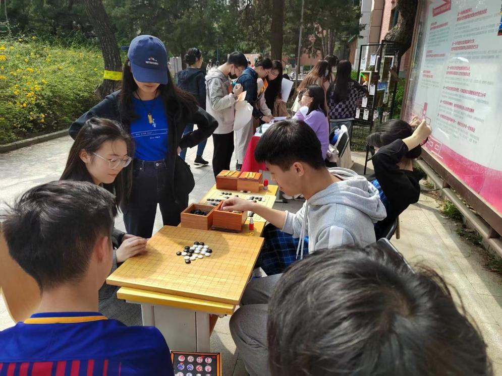 游园会开始后,许多同学为棋类的魅力所吸引,在摊位前学习或进行对局。
