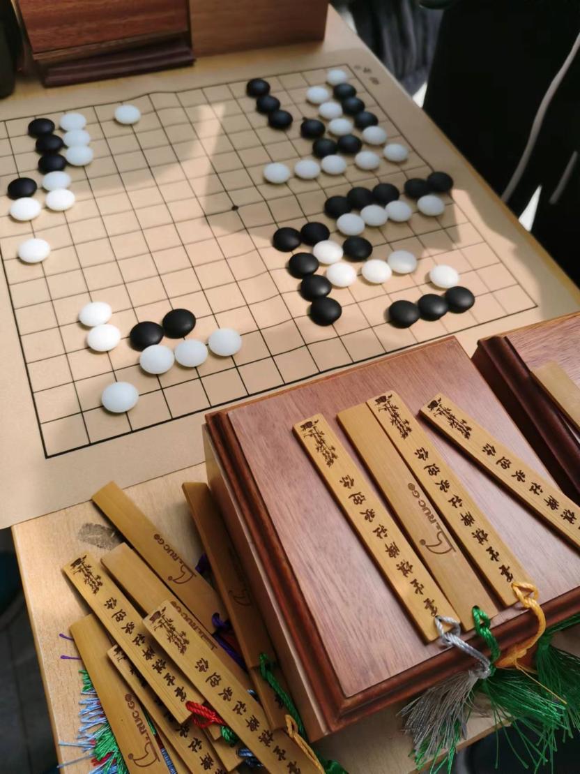 在本次游园会活动中,墨尘棋牌社准备了精美书签作为纪念品,并向同学们展示了云子,介绍围棋棋子制造工艺的讲究。云南围棋子简称云子,云子的白子微带翠绿,温润如玉,柔而不透,而盒子厚重,对光时呈现半透明的碧绿色。