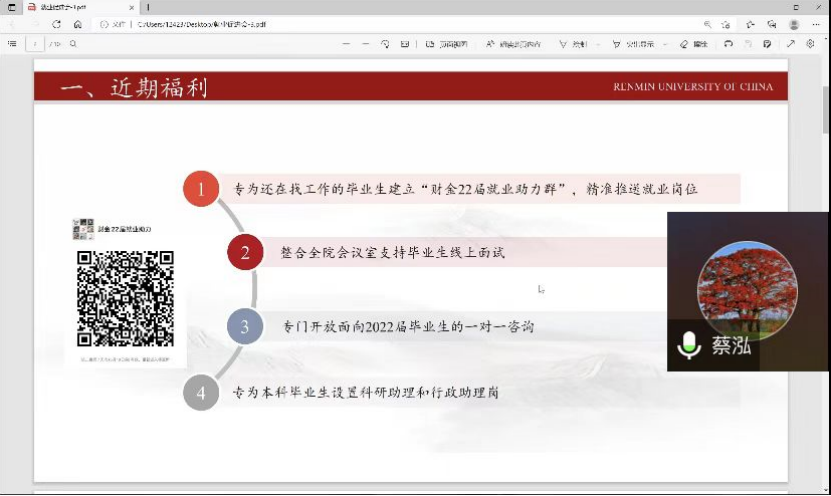 随后,蔡老师结合最新就业政策介绍了公司近期“就业福利”,包括建立“财金22届就业助力群”,精准推送就业岗位;整合公司资源支持线上面试;专门开放面向2022届毕业生的一对一咨询以及科研助理和行政助理岗。蔡老师建议对考研二战把握并不大的同学静下心来认真分析一下,重新进行下一轮评估和规划,抓住剩下的小的黄金周期,努力找到自己合适的工作。