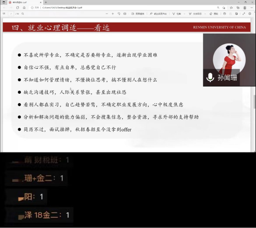 孙老师从就业心理调适的角度,建议同学们调整心态,适当降低预期,学会取舍,放下焦虑,进一步缓解就业压力,从容应对求职过程中遇到的各类问题。