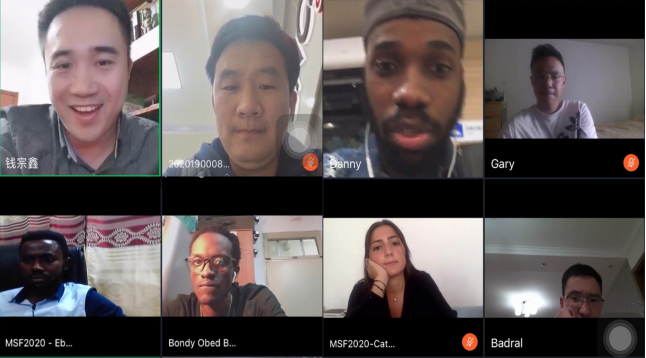 首先,几位2019级MSF项目的在读生分享了一年来的学习感受:“抓住探索中国的机会,利用人大财金丰富的学术资源,多与老师进行交流...”老生们纷纷给出建议。随后,宋元元邀请2020级的新生们在线上进行自我介绍与交流。同学们分别来自加拿大、葡萄牙、越南、马来西亚、蒙古、肯尼亚、加纳、弗得角等国家,因为新冠疫情的影响,许多同学暂且不能来华,非常期待有一天能够在人大校园团聚。