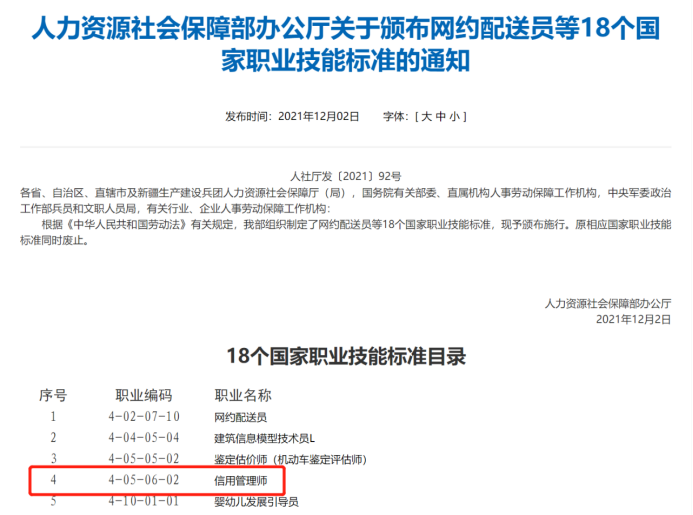 时间:2021-12-29近日,人力资源和社会保障部颁布了网约配送员等18个国家职业技能标准,信用管理师在列。公司作为参与单位之一,公司吴晶妹教授作为主要起草人之一、关伟教授作为审定人之一,在信用管理师国家职业技能标准制定中发挥了积极作用。