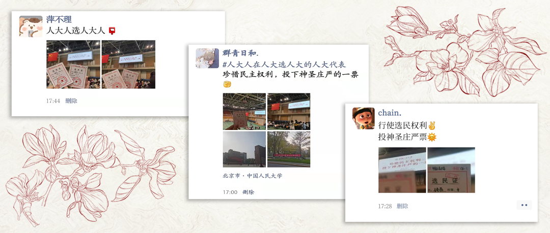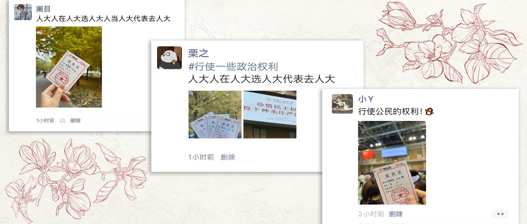 作为一个理科生,“参与人大代表选举”、“行使政治权利”这些词汇对于之前的我一直只以政治教材上的教义、中考的复习资料内容、政史地会考的必考题目之类的形式出现。在参与今天的投票之前,我一度也有过“投票不过是‘填写-投选’的过程,并没有什么特别之处”的想法。但当拿到自己的选民证,亲身走进世纪馆,阅读候选人资料,并在选票上填下自己的选择并亲手将选票投进投票箱之后,我感受到的是所有人对于身处兴盛的祖国,行使法律赋予自己的政治权利的由衷的自豪感,是参与人大代表选举活动的庄重。在这个过程中我改变了自己之前的看法,手中改了章的选票已然是值得珍藏记忆的符号。