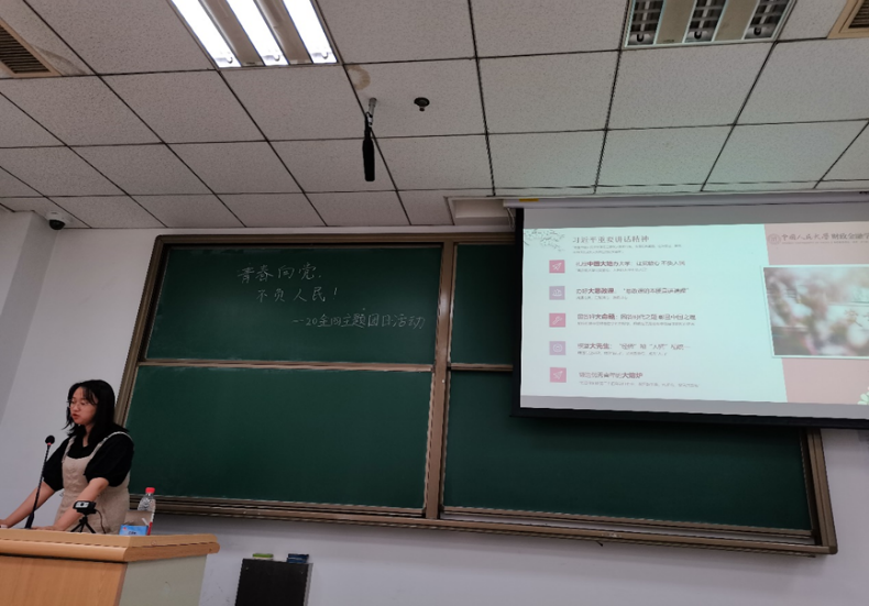 本周二的团日活动上我们学习了习近平总书记重要讲话精神,观看了《习近平与老员工朋友们》系列采访实录,还听了参与活动的同学的经历和感悟,我收获颇丰。作为人大学子,我们要以“复兴栋梁,强国先锋”为目标严格要求自己,努力践行“青春向党,不负人民”的誓言。作为新时代的青年,我们要勇担民族复兴大任,不负党和人民,不辜负总书记的期许,珍惜在大思政课的宝贵学习机会,积极向大先生们求教,争做开路先锋,做闯将,做民族英雄。