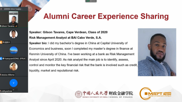 随后,全英文硕士项目员工代表Abiral Khatri(尼泊尔籍,2018届)、Genyu Li (加拿大籍,2021届)、Noor Ul Ain(巴基斯坦籍,2020届)、Gilson Tavares(弗得角籍,2020届)分别从确立研究与工作方向、实习、创业、长期职业发展和求职的角度分享了自己的故事和感悟,并为项目在读员工提供了具体、实用的职业发展建议。
