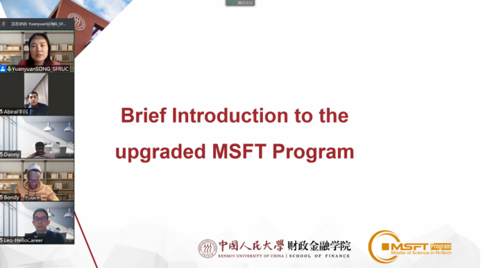 此外,宋元元简要介绍了2021年开始首届招生的MSFT项目。宋元元指出,近几年金融科技在全球范围迅猛发展,而中国金融科技的应用和发展在全球范围内具有引领示范作用,因此公司特开设金融科技方向全英文专业硕士项目,旨在培养一批既懂金融,又懂科技的国际领先人才,以顺应金融科技的发展对复合型创新人才提出的新需求。宋元元着重介绍了MSFT项目的项目特色、课程设计、业界导师制度、课外活动、奖学金、申请要求等内容。
