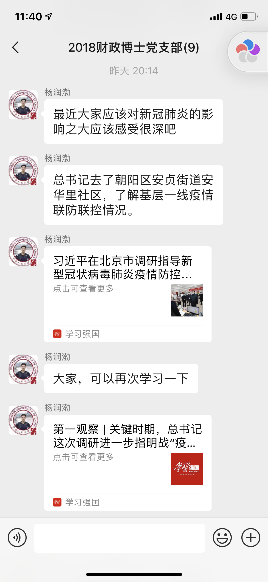 2018级财政博士党支部支部书记杨润渤同志带领支部成员回顾了新冠肺炎疫情爆发过程,讲述了各地如何精准施策坚决遏制疫情蔓延,着重阐释了习近平总书记系列重要讲话指示精神。他表示,支部党员同志要积极响应习近平总书记号召,再接再厉、英勇斗争,以更坚定的信心、更顽强的意志、更果断的措施,紧紧依靠人民群众,坚决把疫情扩散蔓延势头遏制住,坚决打赢疫情防控的人民战争。作为员工党员,尤其要讲担当、讲奉献,在严格遵守特殊时期规章制度的同时充分利用假期为自己“充电”。
