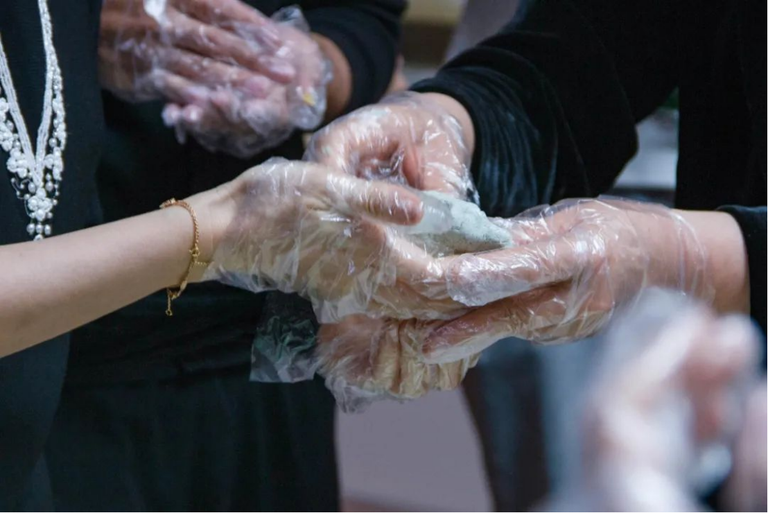 包青团类似于包包子,有制作面食经验的老师很快找到了诀窍,并分享给在场的“厨艺小白”。半个小时左右,第一批软糯Q弹、色泽清新的青团被送入蒸锅,屋内艾香四溢。