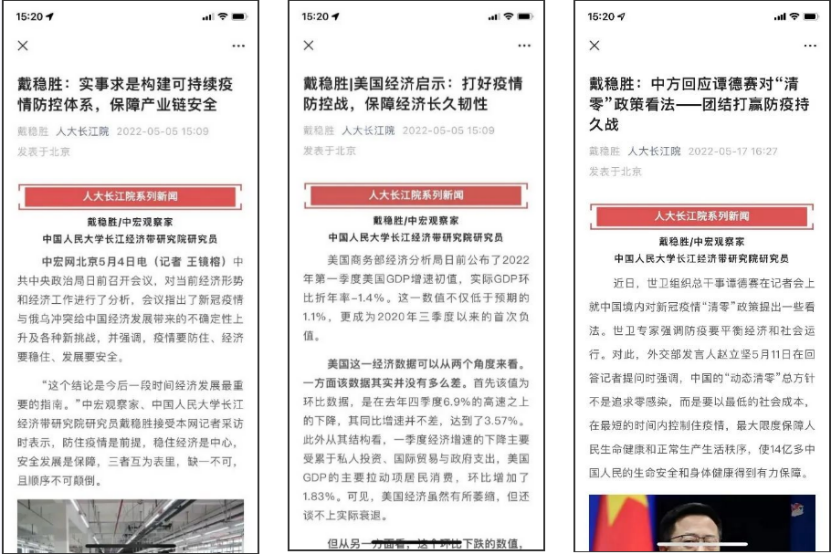 戴稳胜教授接受中宏网采访、人大长江院约稿时,积极表达专家见解,解读政策导向,引导社会舆论,疏导社会恐慌情绪,提出要“实事求是构建可持续疫情防控体系,保障产业链安全”,“打好疫情防控战,保障经济长久韧性”,“团结一心,坚决打赢动态清零防疫持久战”,不断激发正能量,推动形成共同抗击疫情的社会共识。