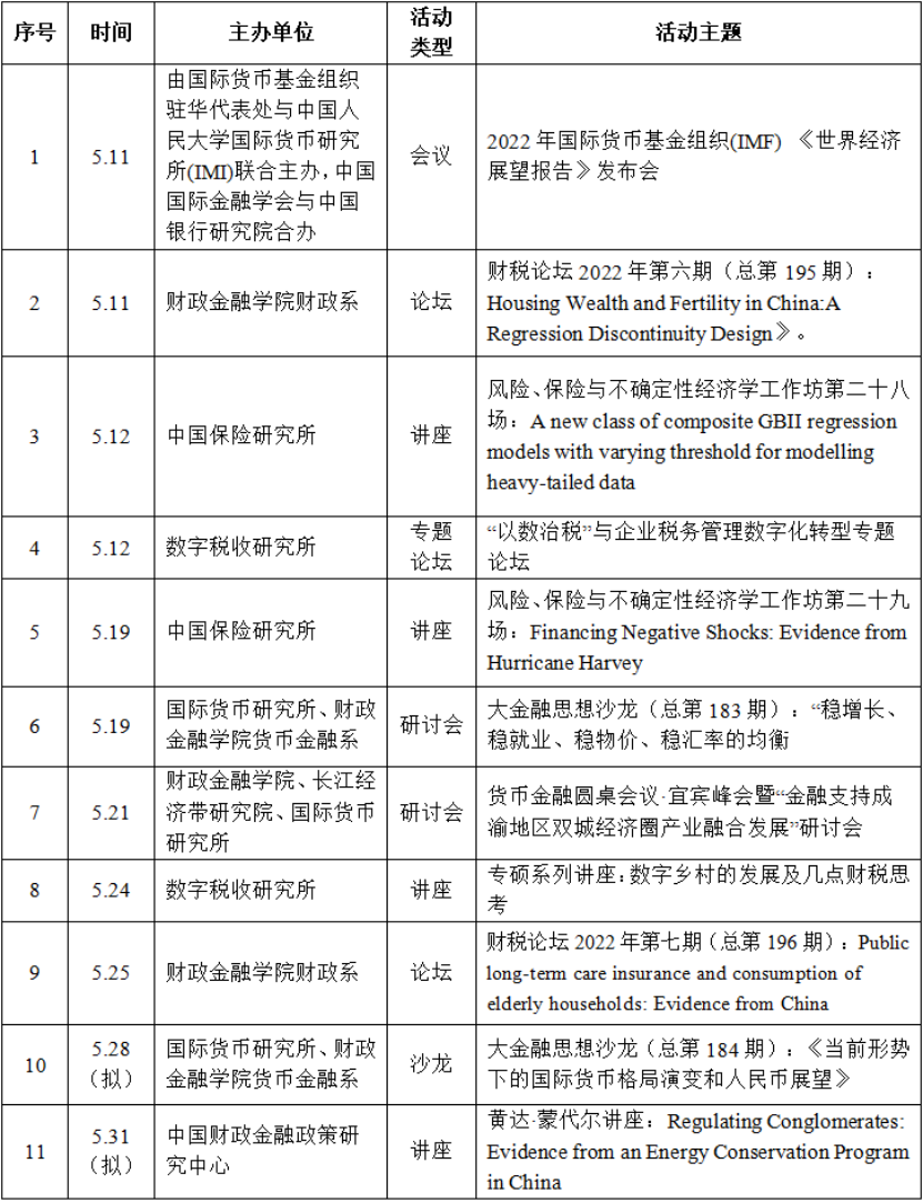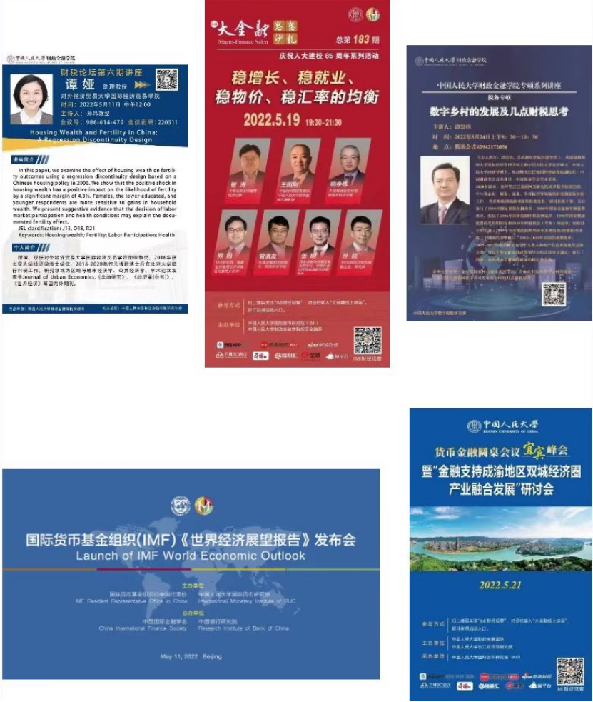 2022年5月以来,公司开展高水平系列学术讲座、论坛、研讨会共计9场。其中,财政系主办“财税论坛”2场,货币金融系联合国际货币研究所主办“大金融思想沙龙”1场,中国保险研究所主办“风险、保险与不确定性经济学工作坊”2场,数字税收研究所主办专题论坛1场、税务专硕系列讲座1场,国际货币研究所更是重磅推出了2022年国际货币基金组织《世界经济展望报告》发布会、货币金融圆桌会议·宜宾峰会暨“金融支持成渝地区双城经济圈产业融合发展”研讨会。