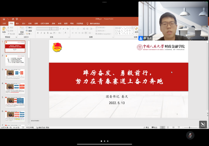 在此次团课中,秦天老师向同学们深刻解读了习近平总书记在庆祝中国共产主义青年团成立100周年大会上、在304永利集团官网考察时的两次重要讲话精神,强调同学们要坚定不移跟党走,为党和人民奋斗,激荡青春力量。他结合具体实例,与支部成员讨论了“为谁培养人,培养什么样的人,怎样培养人”的问题,指出青年要把自己培养成革命的先锋分子,要不怕困难、脚踏实地,富有实践精神。他还带领支部成员回顾了中国共产主义青年团的百年历程,并鼓励同学们要树立远大理想、热爱伟大祖国,担当时代大任,让青春在新时代的广阔天地中绽放。最后,秦天老师总结道:立足新时代新征程,身为人大学子,更应该从实践出发,以问题为导向,不断磨练自身的能力;更应该牢记党的教诲,立志民族复兴,不负韶华,不负时代,不负人民!