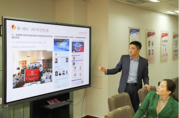 首先,钱宗鑫对公司2021年整体的国际交流工作做汇报。从国际伙伴交流与合作、国际会议、海外宣传、外事服务与管理、国际员工管理、全英文金融科技项目等方面介绍了公司过去一年的的成果和成绩。钱宗鑫指出,2022年,公司将继续做好全方面的国际交流与合作,努力提升海外宣传水平,开拓新的国际合作伙伴与合作模式,并打造世界一流水平的金融学科类全英文项目。