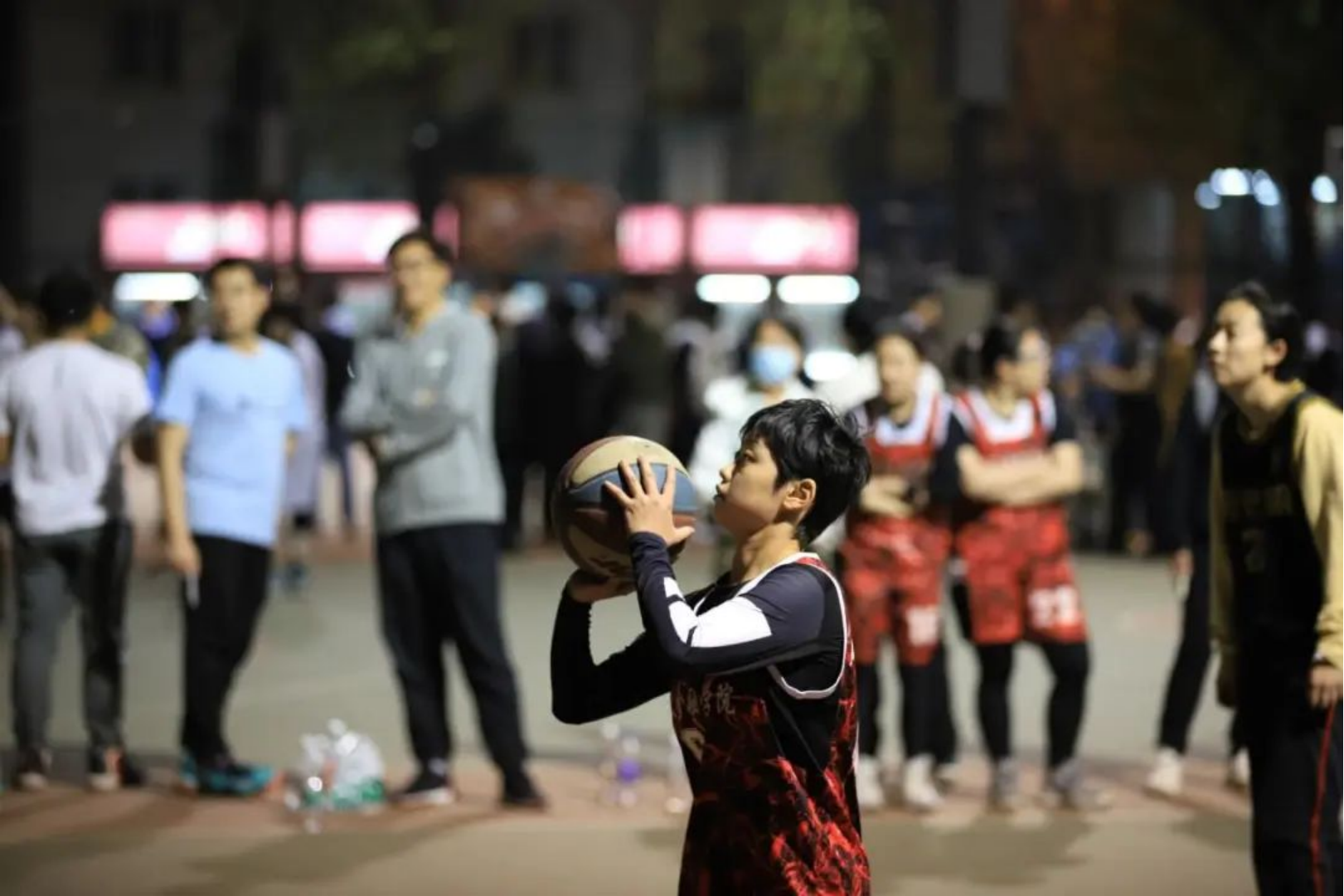 4月14日晚,女篮季后赛第三场在品园篮球场展开角逐。财金女篮对阵历史公司女篮。晚风微凉,两方队员早早到达赛场,进行热身和战术讨论。