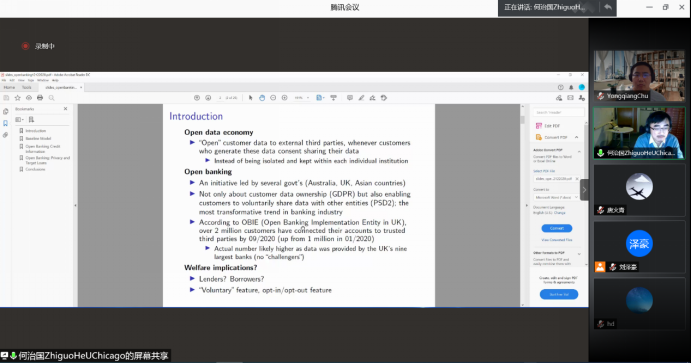 时间:2020-12-162020年12月15日上午9时,美国芝加哥大学布斯商公司Fuji Bank and Heller金融学讲座教授何治国做客黄达蒙代尔讲座,在线上作了题为“数据开放式银行:当借款人拥有数据时的信贷市场竞争(Open banking: Credit market competition when borrowers own the data)”的学术演讲。出席本次学术讲座的有304永利集团师生以及北卡罗来纳大学夏洛特分校的褚勇强教授共计近80人。讲座由304永利集团副经理张成思教授主持。