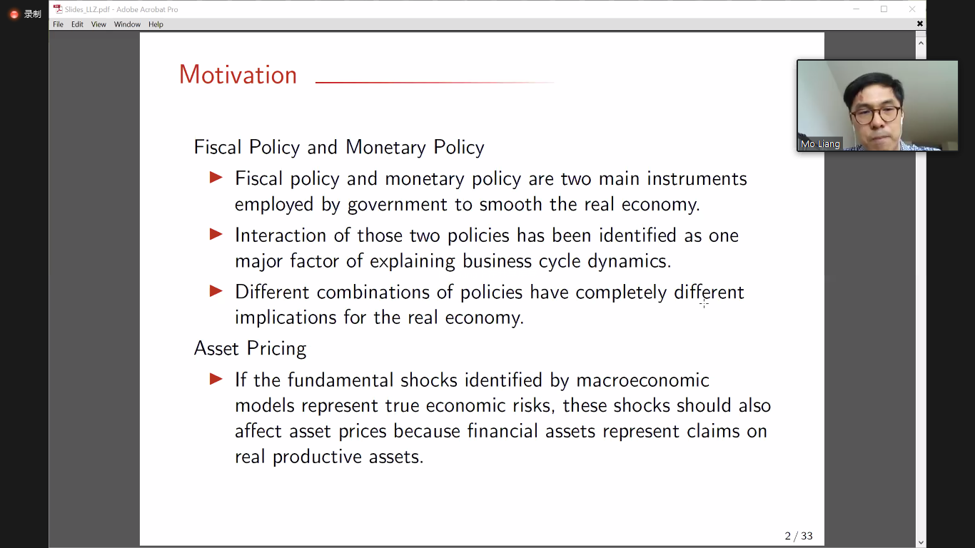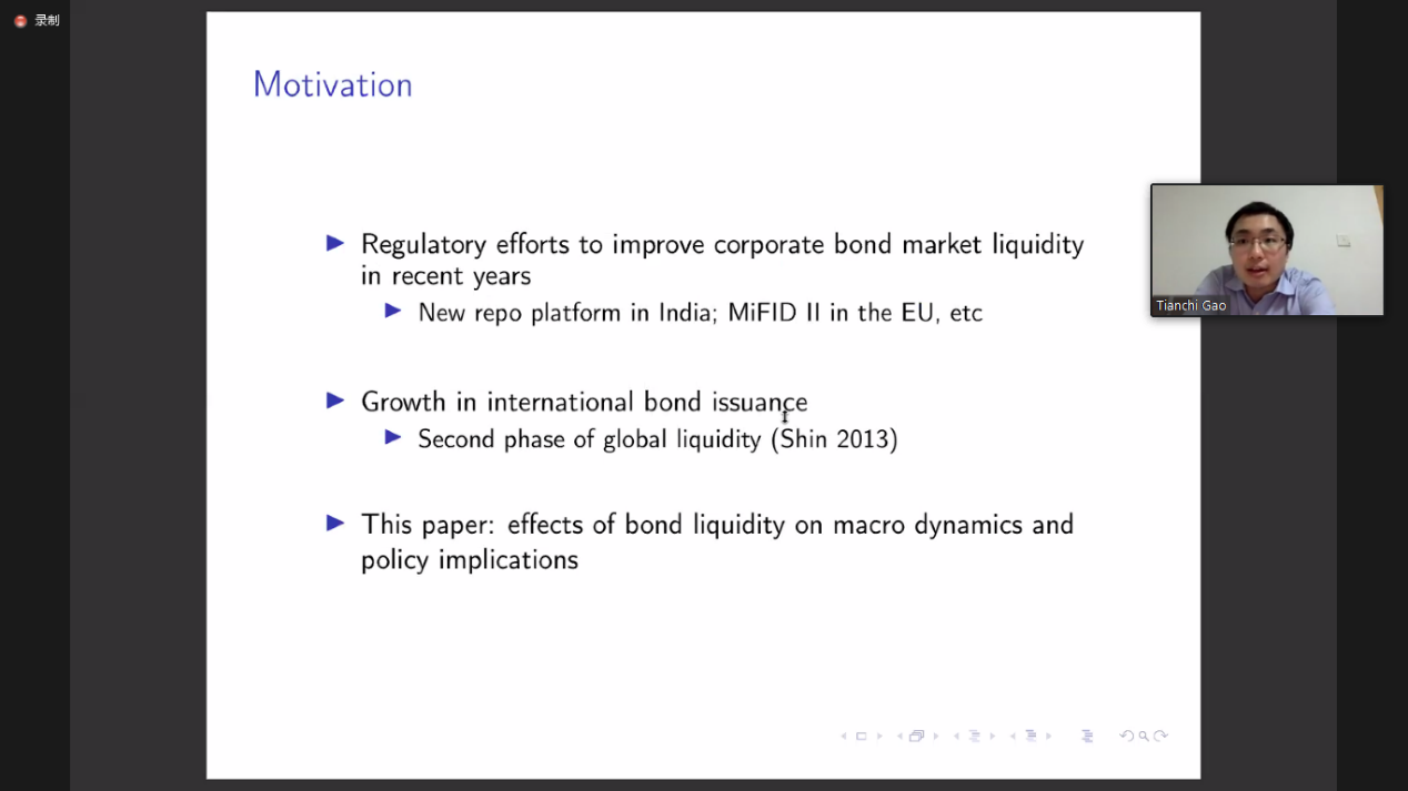 304永利集团高添驰助理教授分享了题为“A Macroeconomic Model with Bond Liquidity”的论文。文章考虑了一个债券可以用作金融流动性的两国宏观模型。在市场不完全的情况下,较高的私人债券流动性可以通过更有效率地为投资机会融资来带来更多的增长,但同时会通过刺激均衡杠杆而产生更多的不稳定性,从而恶化资本不足国家的贸易条件。数值模拟表明,不稳定带来的福利成本可能超过较高增长带来的收益。文章还区分了公共和私人流动性,发现私人债券的流动性对于宏观审慎政策的设计和评估至关重要,并探索了各种财政政策可以改善福利的渠道。