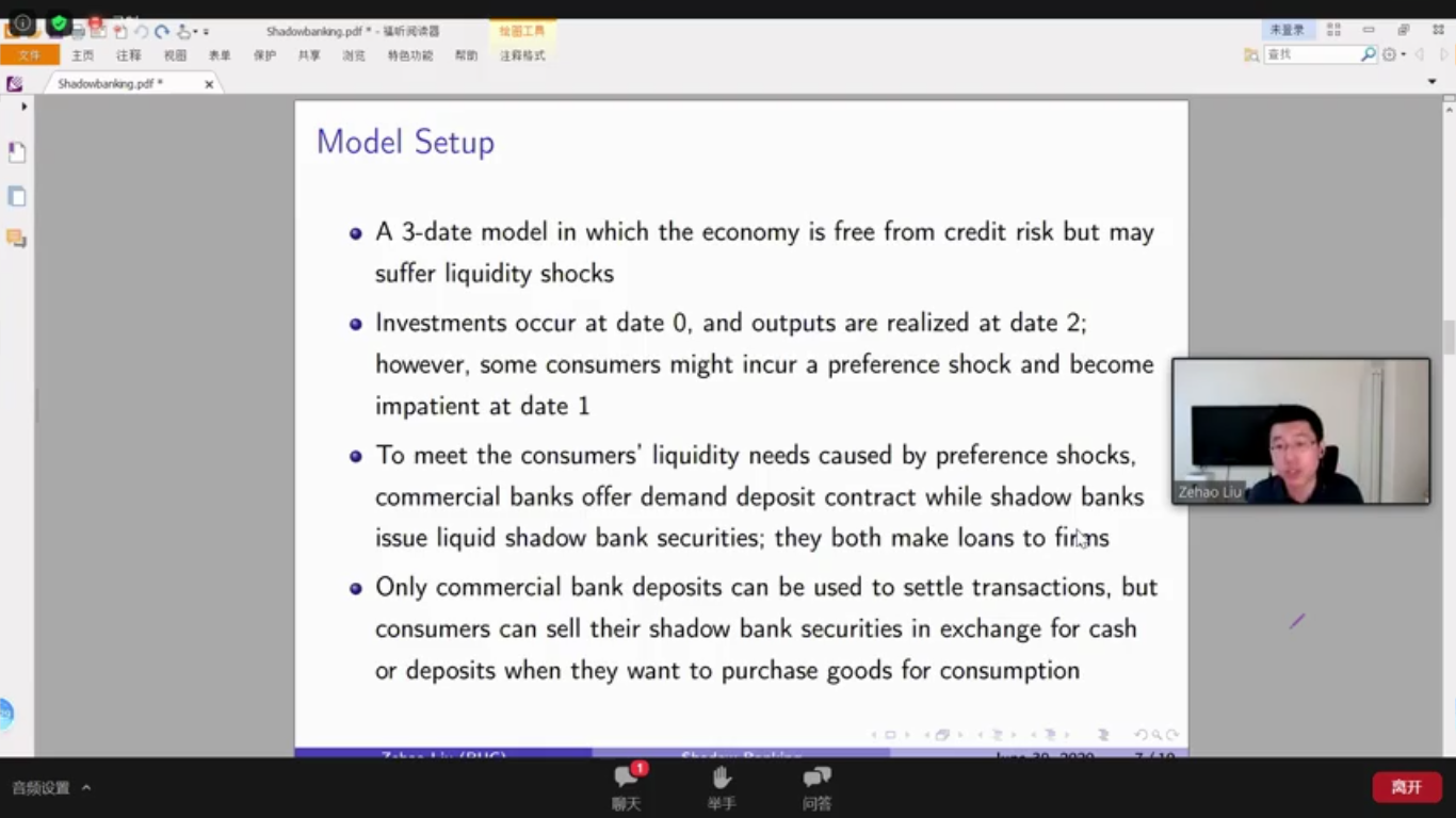 304永利集团刘泽豪助理教授分享的论文“In the Shadow of Shadow Banking: A Liquidity View”研究了影子银行在具有外部货币和内部货币的经济中的流动性作用。将影子银行引入经济会降低以现金和存款总和衡量的货币供应量,而由于影子银行负债具有流动性,支付流动性可能不会减少。由于影子银行在不受流动性法规限制的情况下向企业提供贷款,因此企业可获得的信贷总量增加。影子银行的存在提高了信贷流动性与支付流动性的比率,从而加剧了流动性短缺并导致了过度投资的问题。影子银行负债的流动性的改善可能加剧或缓解过度投资的问题,具体取决于流动性监管的严格程度。