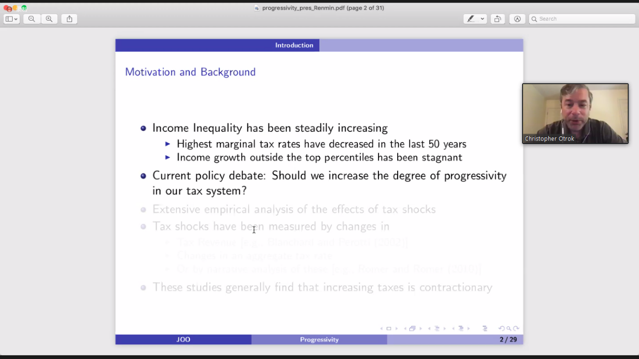 美国密苏里大学Christopher Otrok教授报告的论文是“Tax Progressivity, Economic Booms, and Trickle-Up Economics”。文章提出了一种方法,将税收结构的变化分解为衡量税收水平和累进性的正交成分。文章发现,税收累进性的提高引发了经济繁荣。当税收累进性增加时,高边际消费倾向的收入分配底部人群的可支配收入就会增加,导致消费热潮,从而扩张了总体经济。这种总体经济扩张也使收入分配顶部人群受益,他们在经济繁荣中所经历的收入和资本收益远远抵消了因税收累进性提高而遭受的损失。最终结果是累进性的增加导致不平等的增加而不是减少。